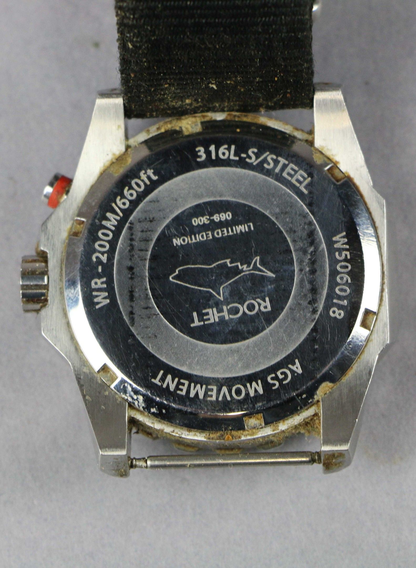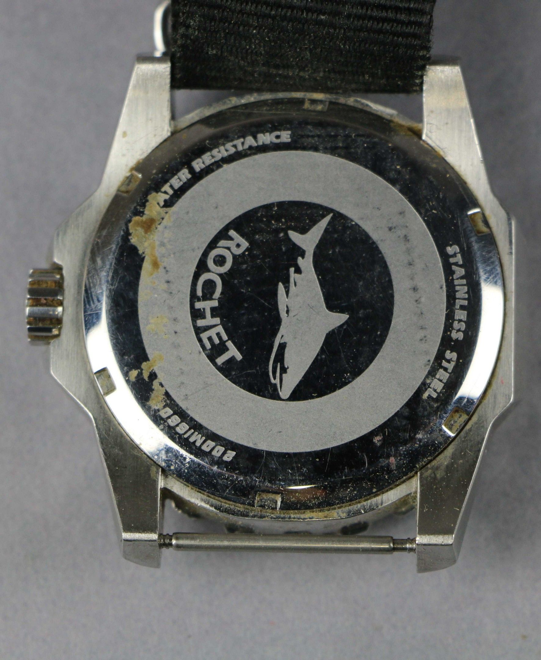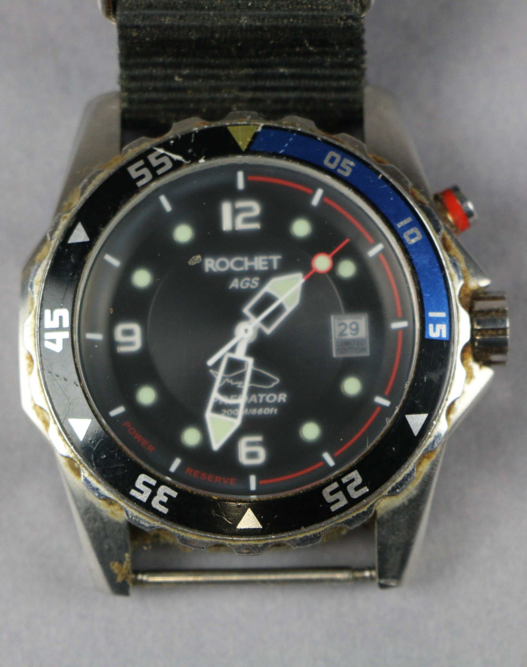 ROCHET : deux MONTRES de plongée modèle Predator 200m à mouvements quartz non fonctionnel (piles à changer). Boîtiers de 43 mm. Avec bracelets tissu rapportés et bracelet cuir rapporté.