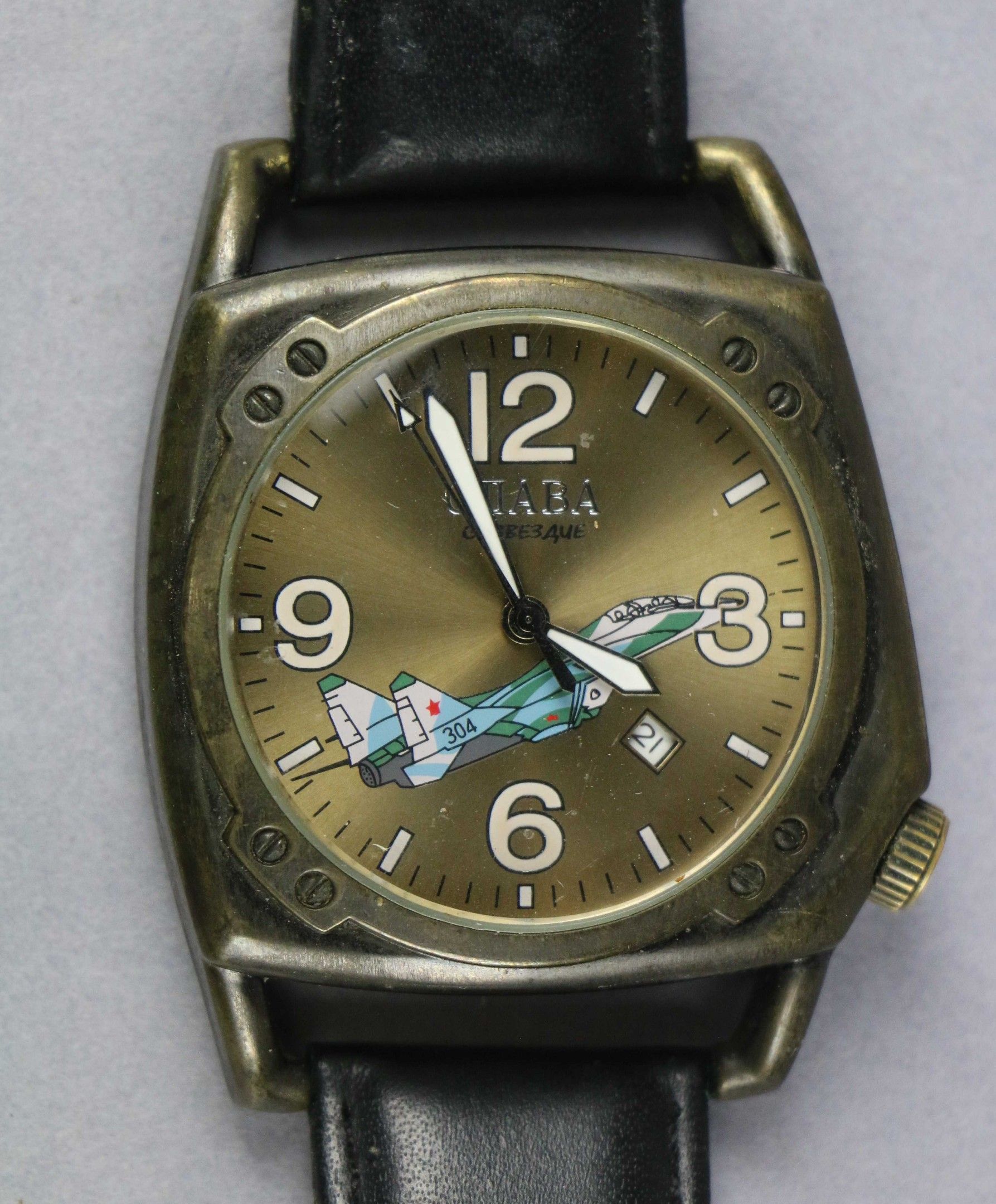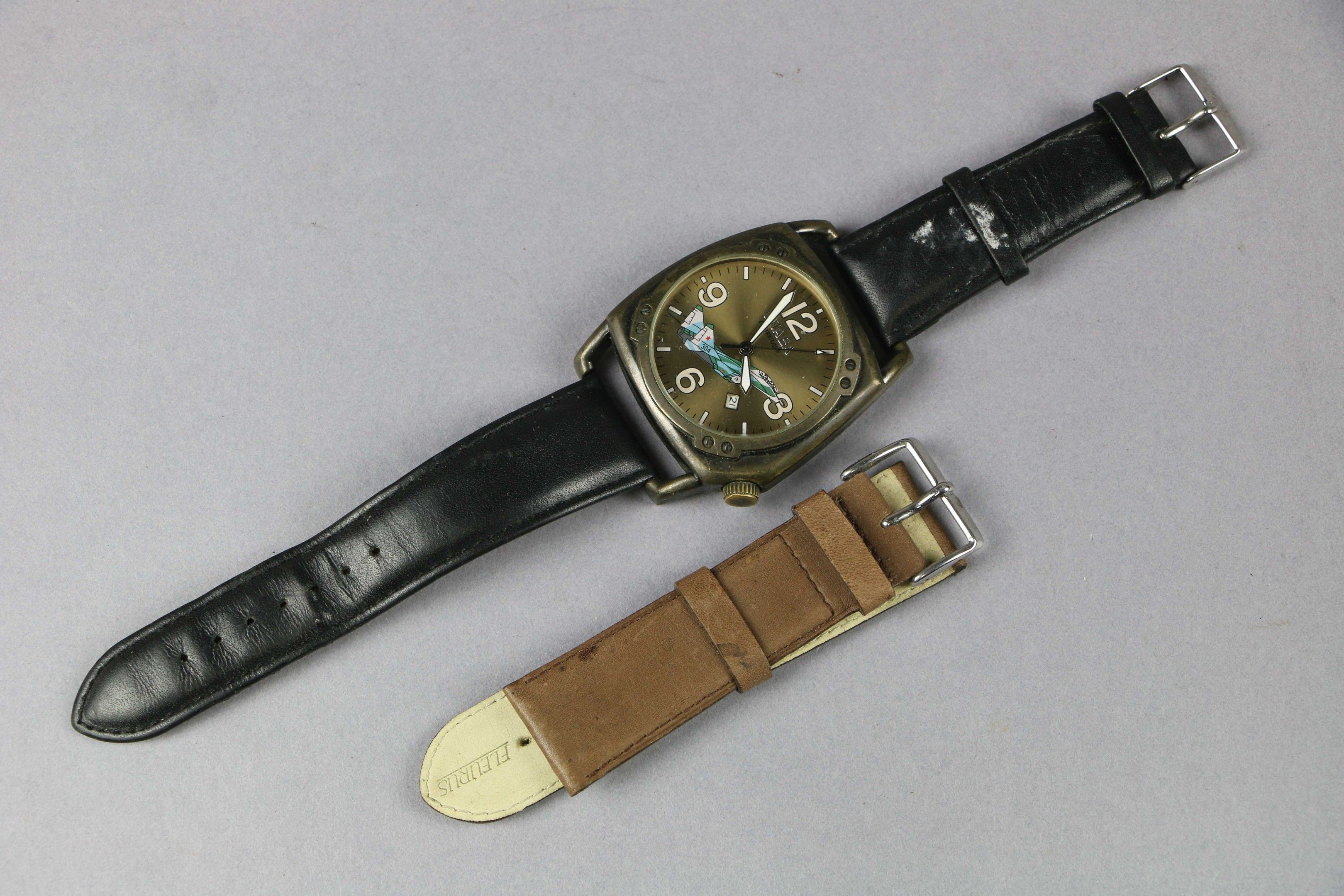CJIABA : MONTRE d'homme de production russe à décor d'un avion de chasse. Mouvement mécanique apparemment fonctionnel. Boîtier de 45 mm.