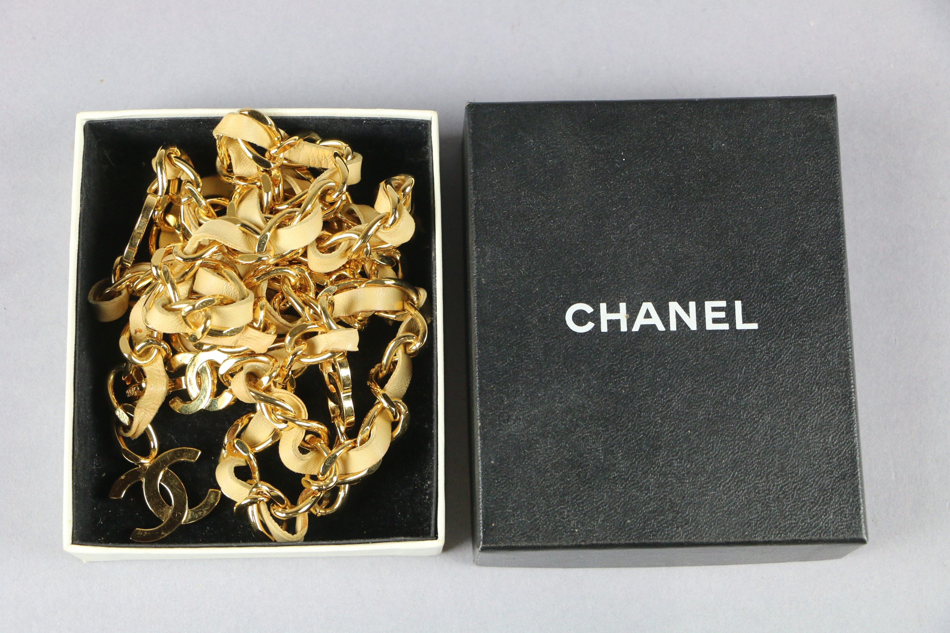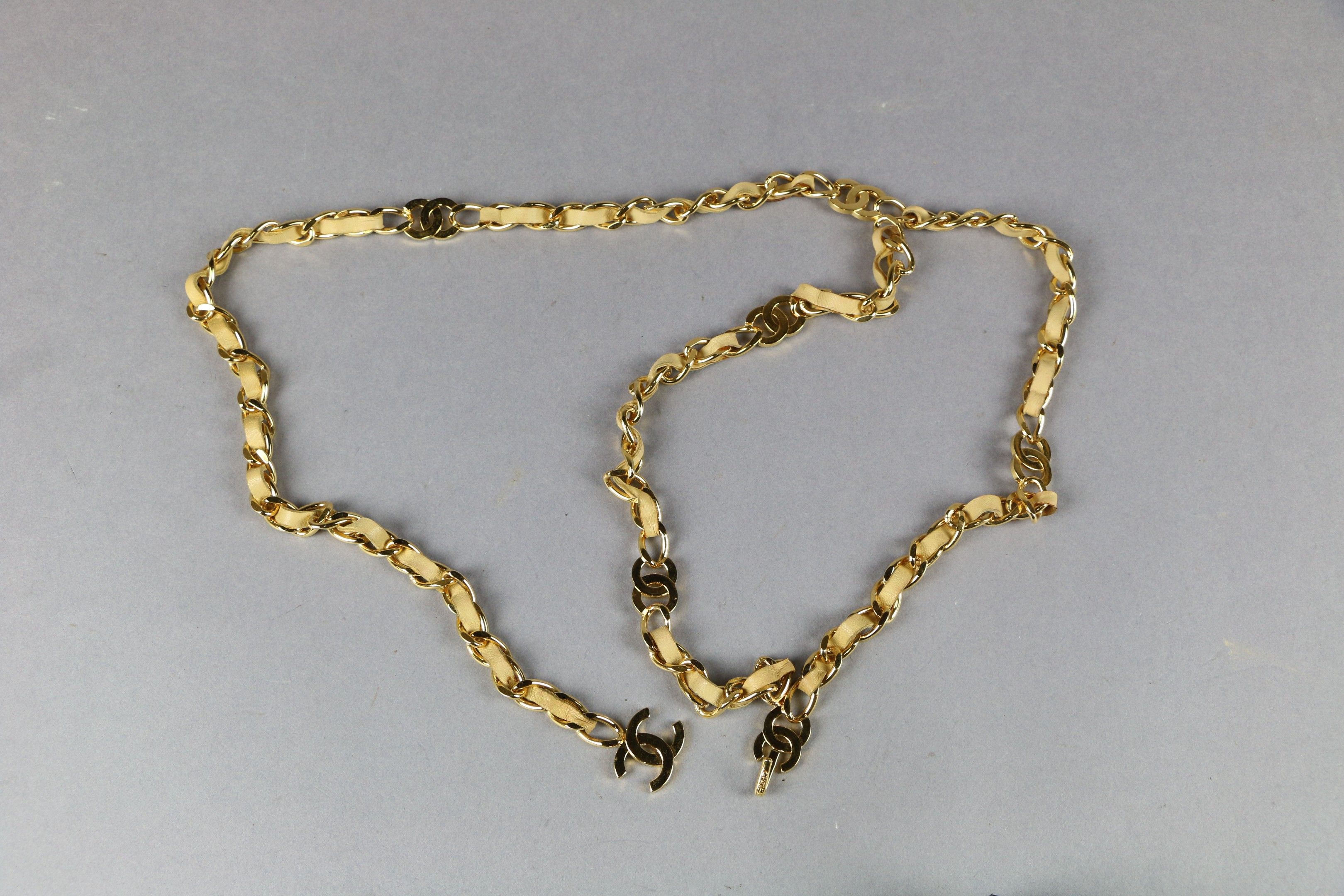 CHANEL : CEINTURE à chaîne en métal doré dédoublée à une extrémité et lanière de cuir beige clair à décor du logo au double C. Marquée et numérotée sur le crochet. Avec sa boîte d'origine.