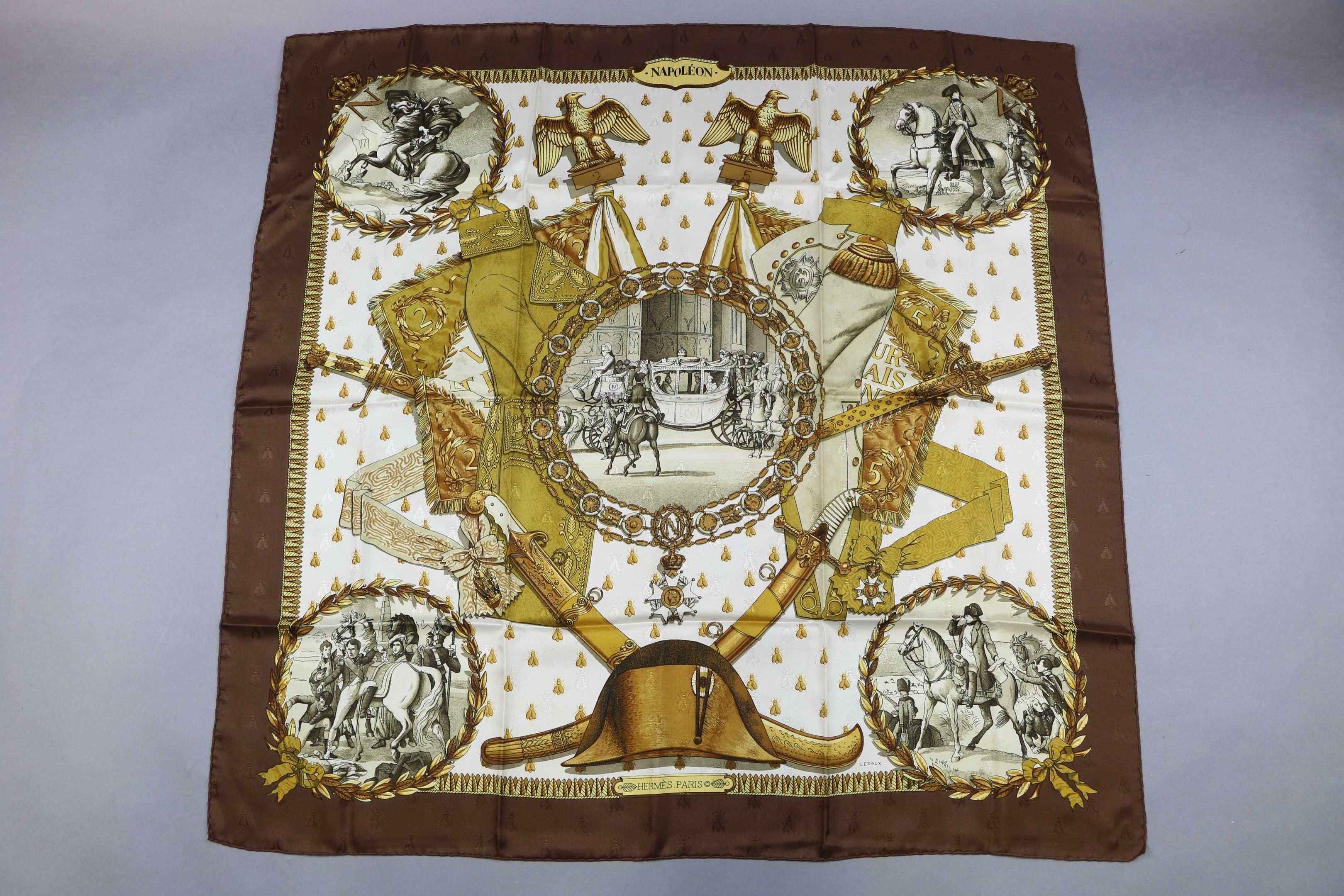 HERMES Paris : FOULARD carré en twill de soie modèle "Napoléon" dessiné par Ledoux.