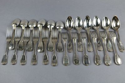 Douze grands COUVERTS en argent à filet de modèles légèremen…