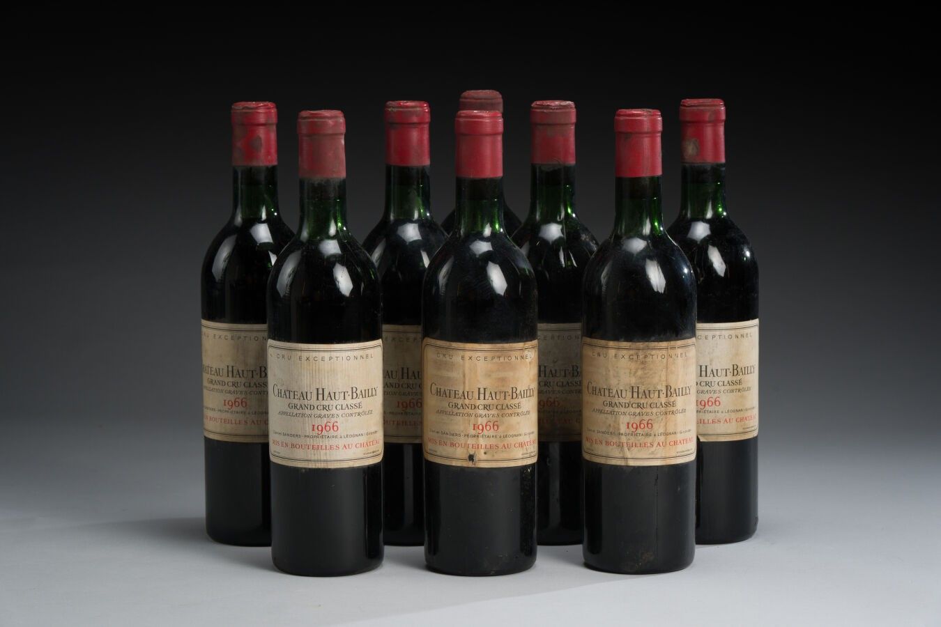 14. 8 bouteilles Château Haut Bailly - Pessac Léognan, 1966. (Étiquettes tachées. 7 légèrement basses).
