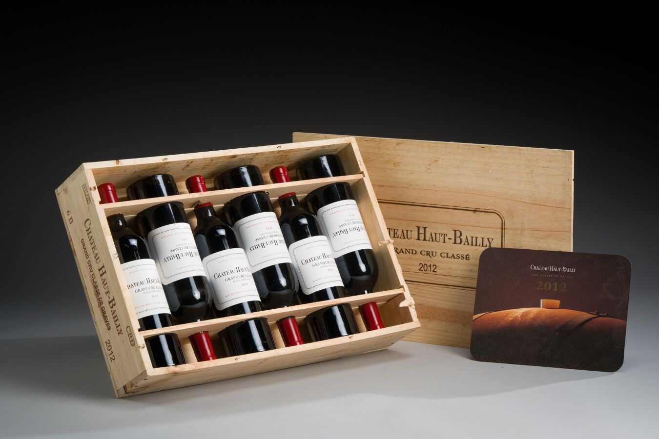 23. 6 bouteilles Château Haut-Bailly, 2012. Dans une caisse en bois.