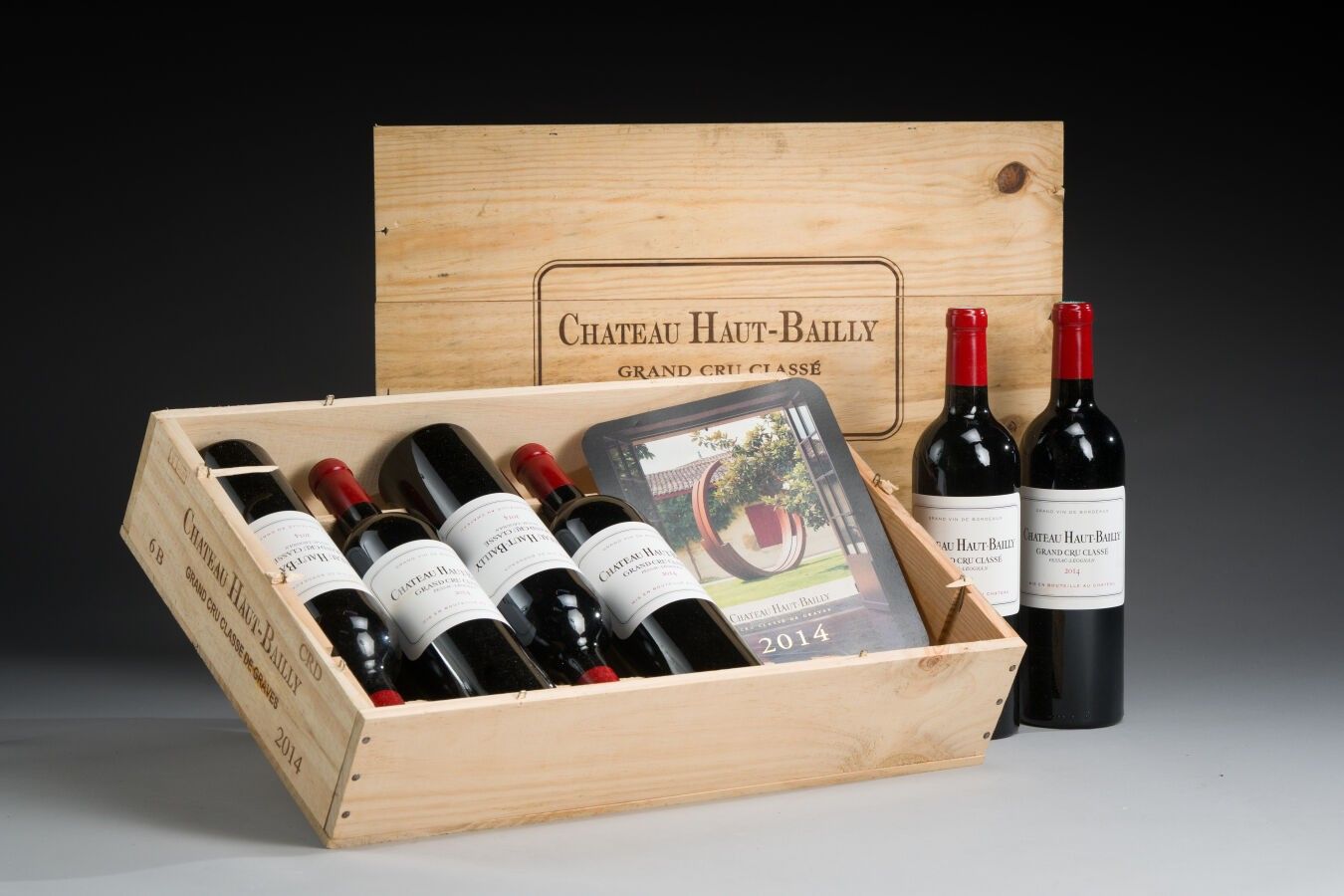24. 6 bouteilles Château Haut-Bailly, 2014. Dans une caisse en bois.