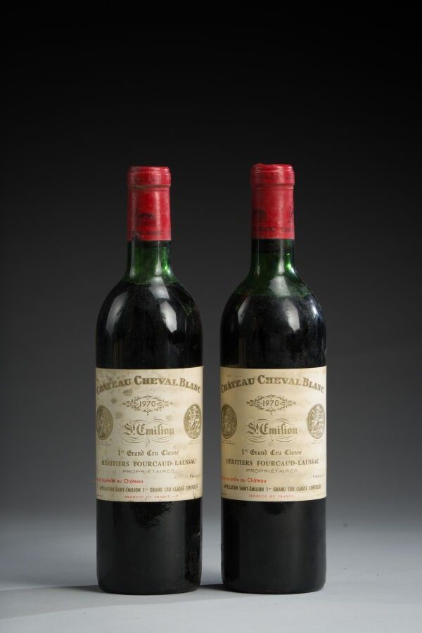 26. 2 bouteilles Château Cheval Blanc - 1er Gc Saint Emilion, 1970. (Étiquettes abîmées, Une légèrement basse une mi epaule)