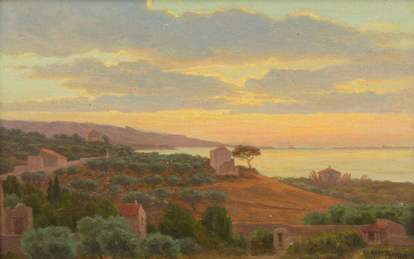 129. Victor BARJON (1845-1920) Paysage d'Italie, bord de mer Huile sur panneau signée en bas à droite. 21 x 34 cm