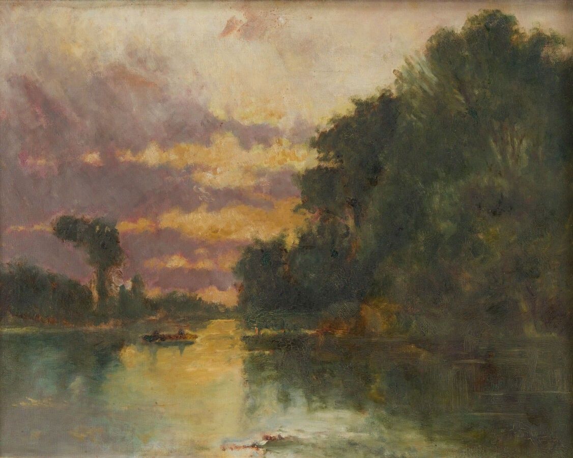 134. École de Barbizon Barque au soleil couchant Huile sur t…