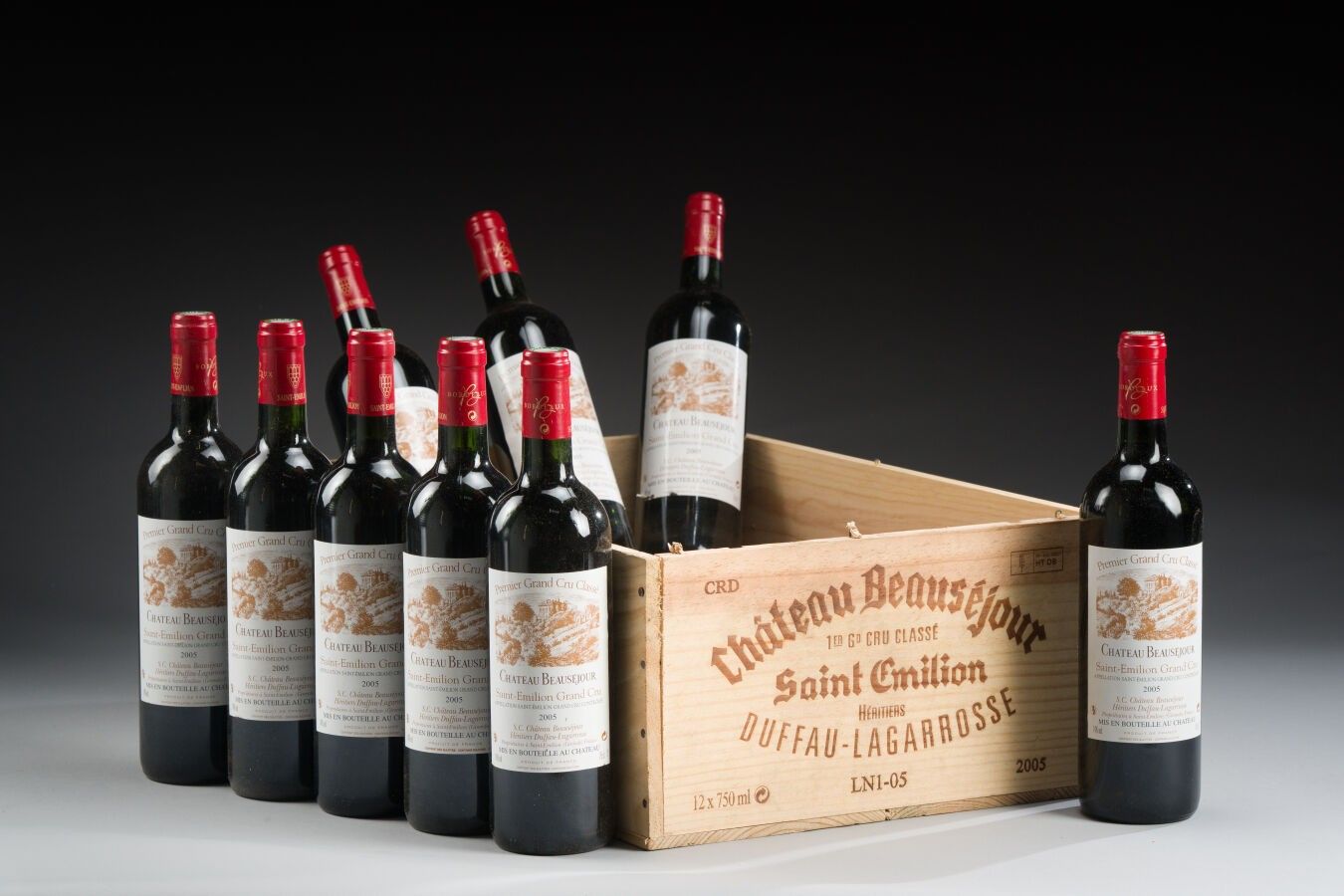 64. 12 bouteilles Château Beauséjour Duffau-Lagarrose, 2005. Dans une caisse en bois.