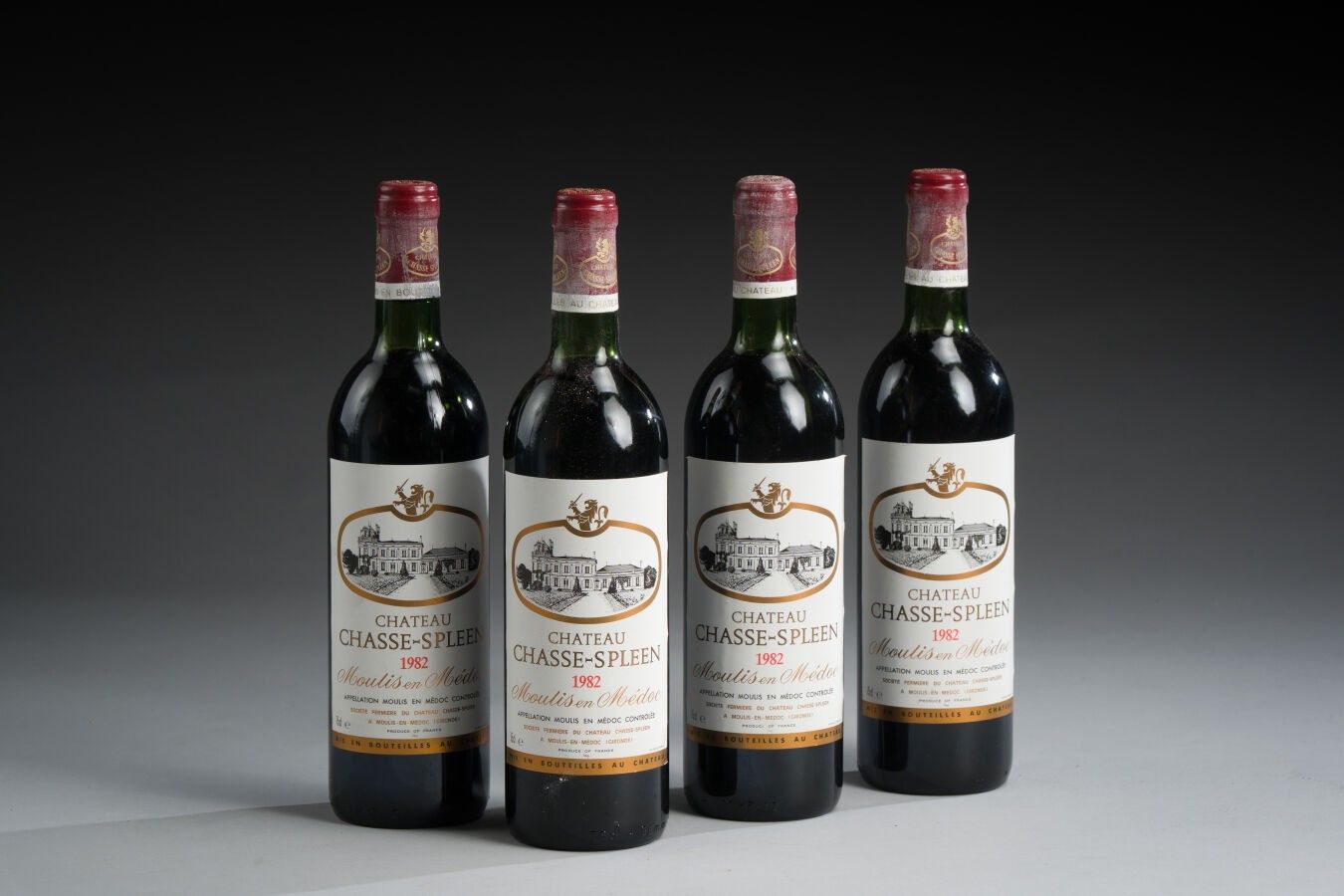 65. 4 bouteilles Château Chasse Spleen - Moulis en Médoc, 1982. (Haute-épaules).