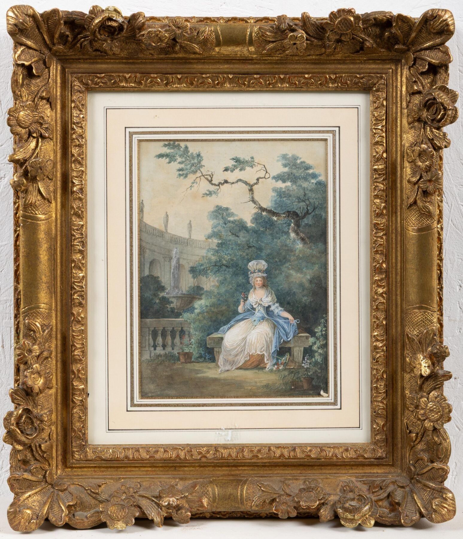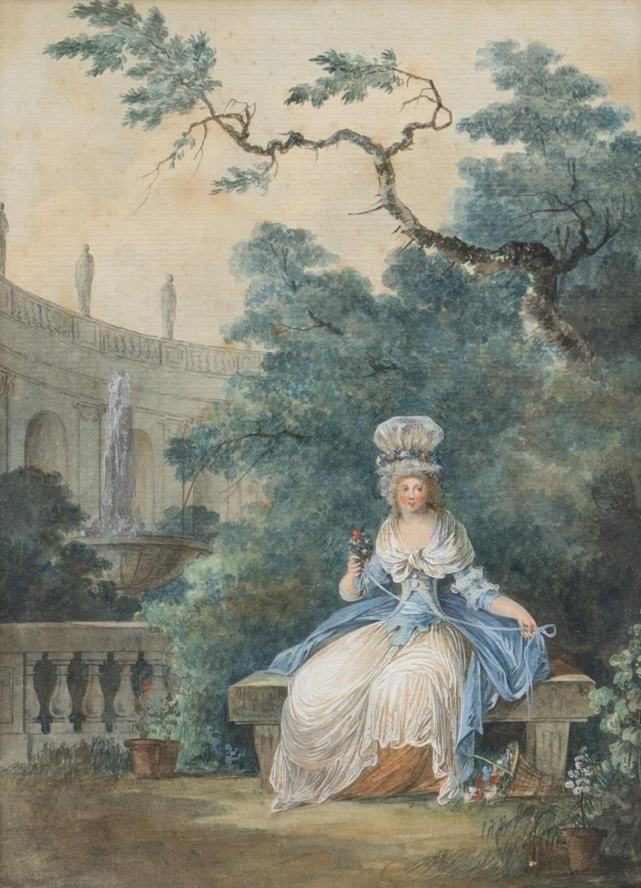 Elégante assise dans un jardin, un panier de fleurs renversé à ses pieds.