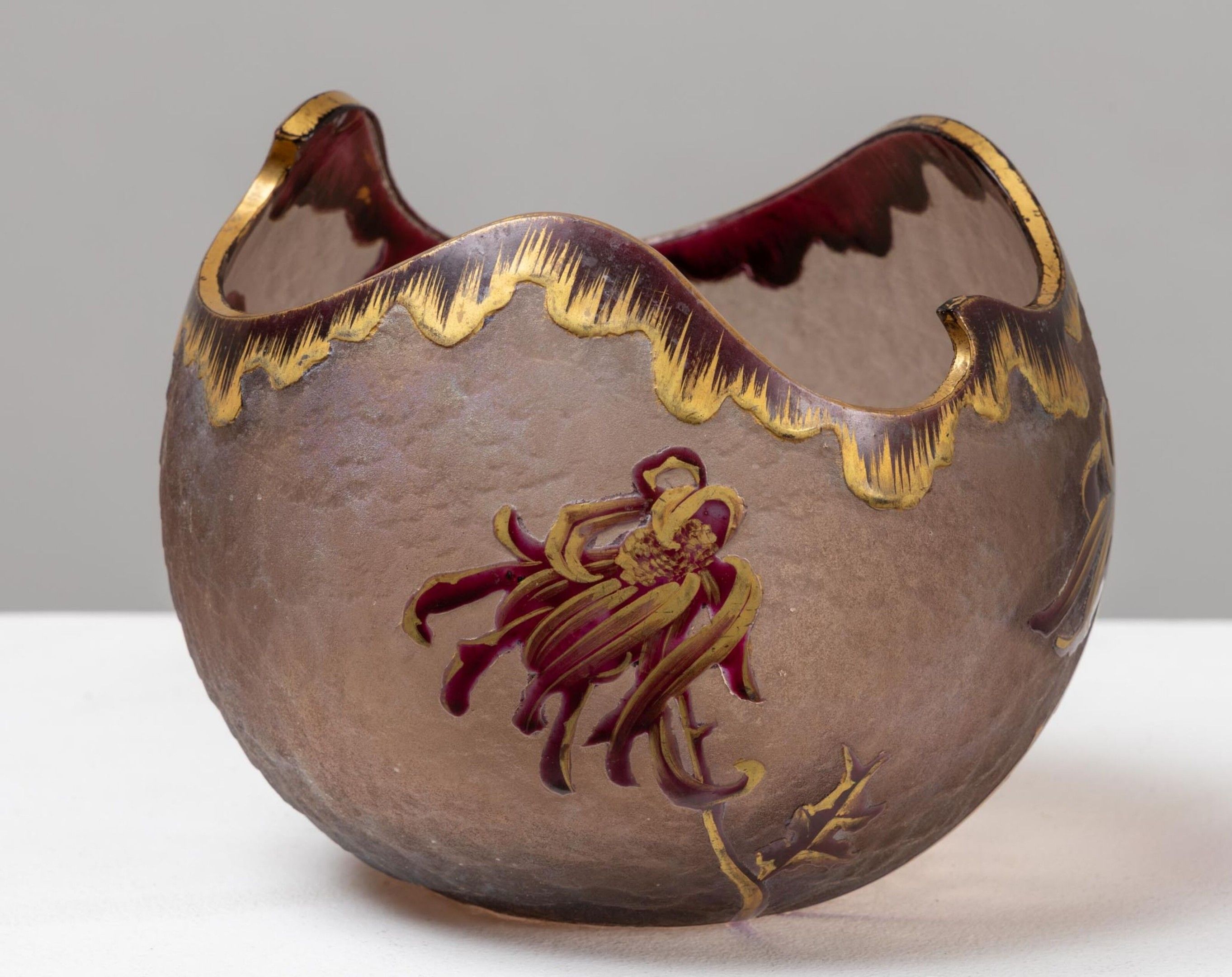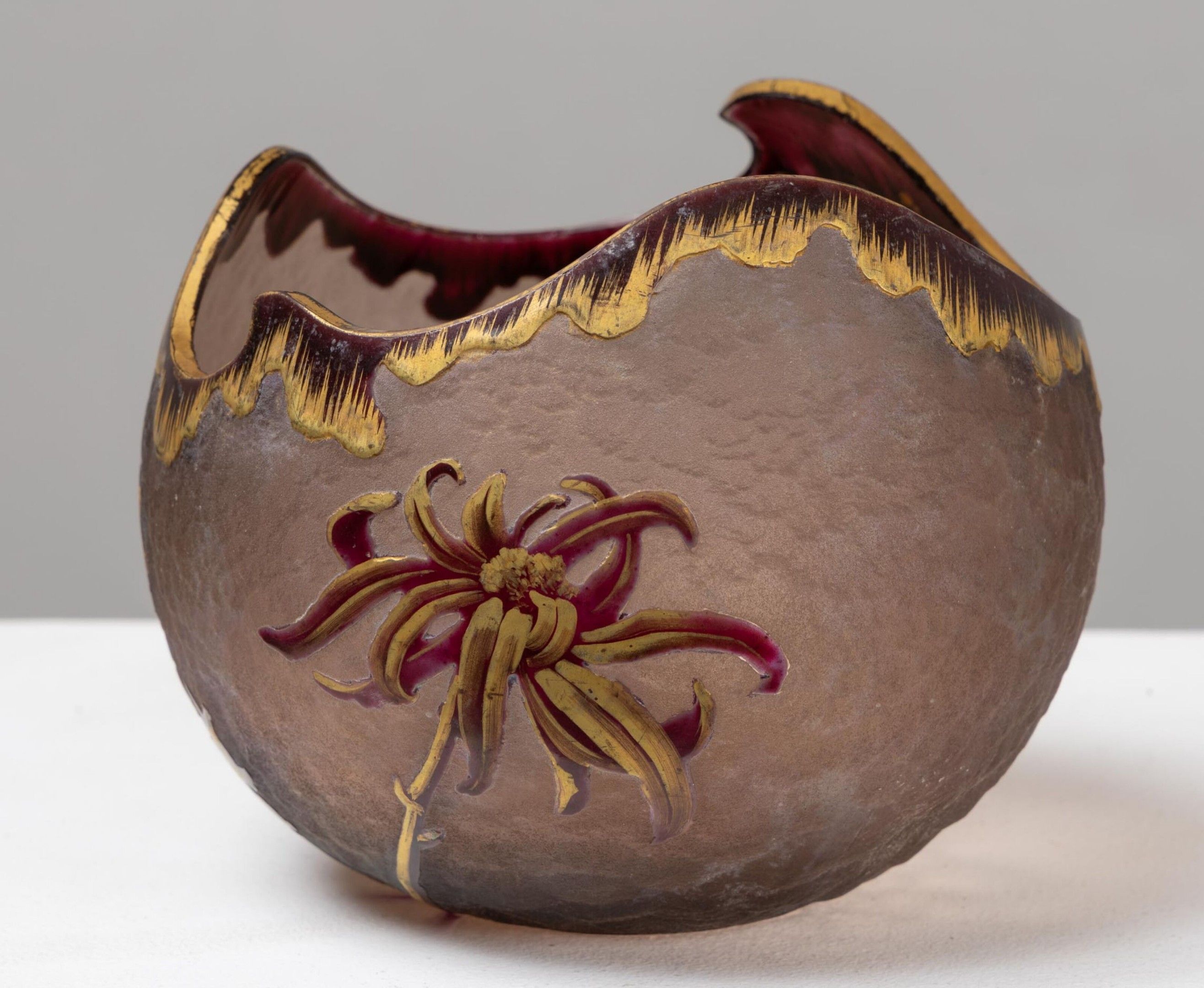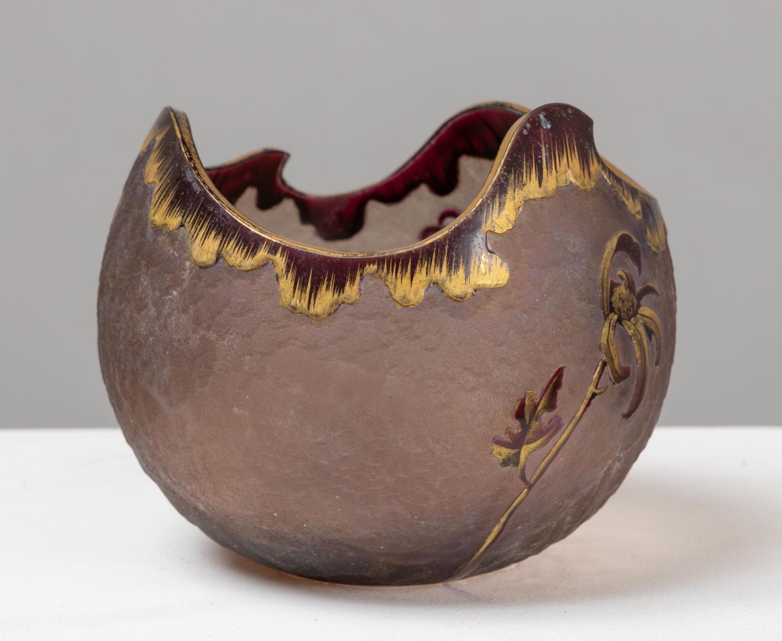 Coupe en verre émaillé et givré violet, à décor en relief de fleurs, rehauts d'or.