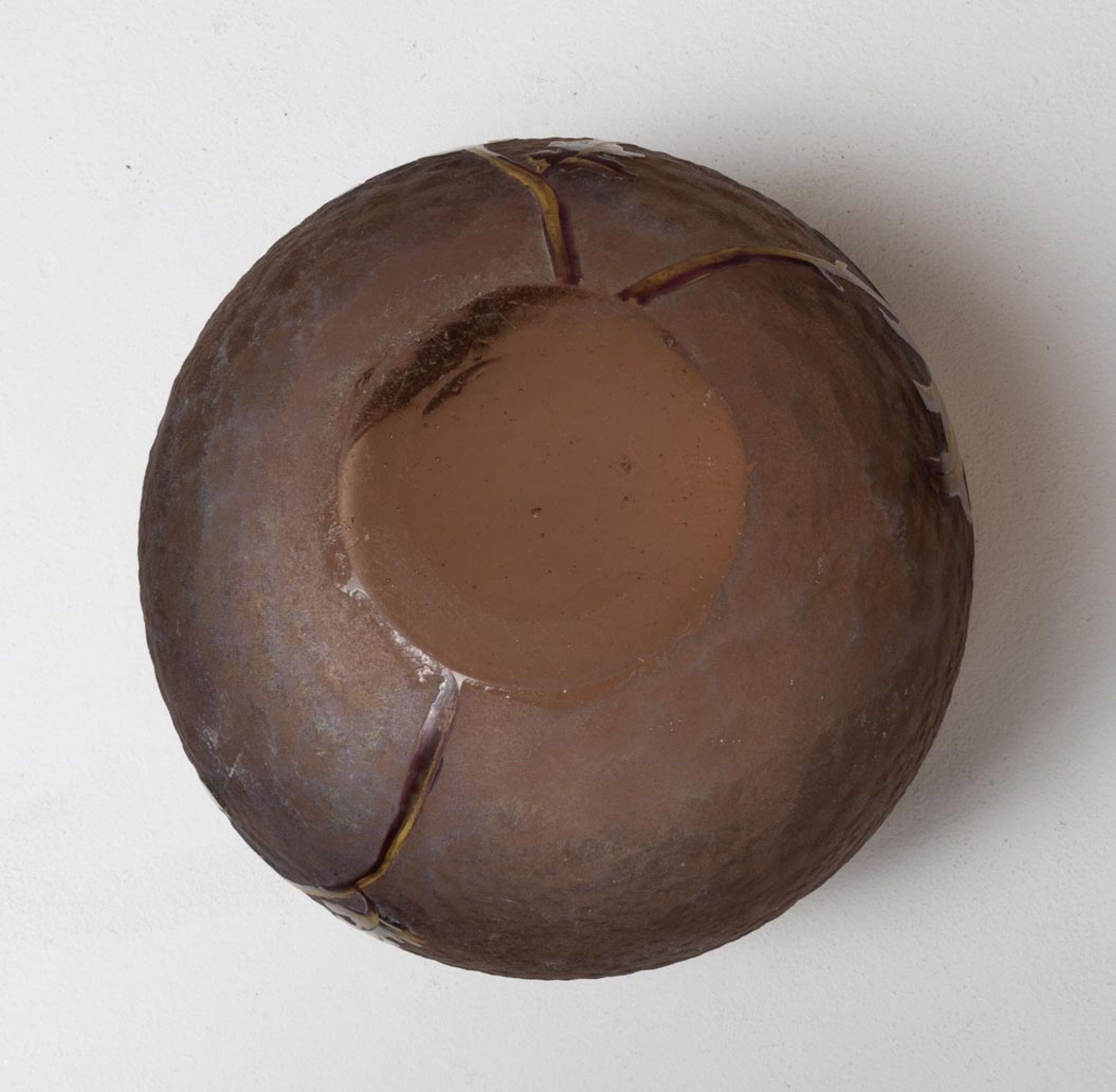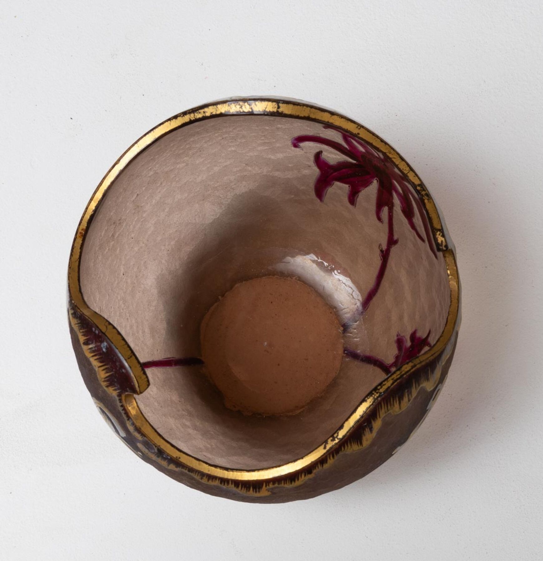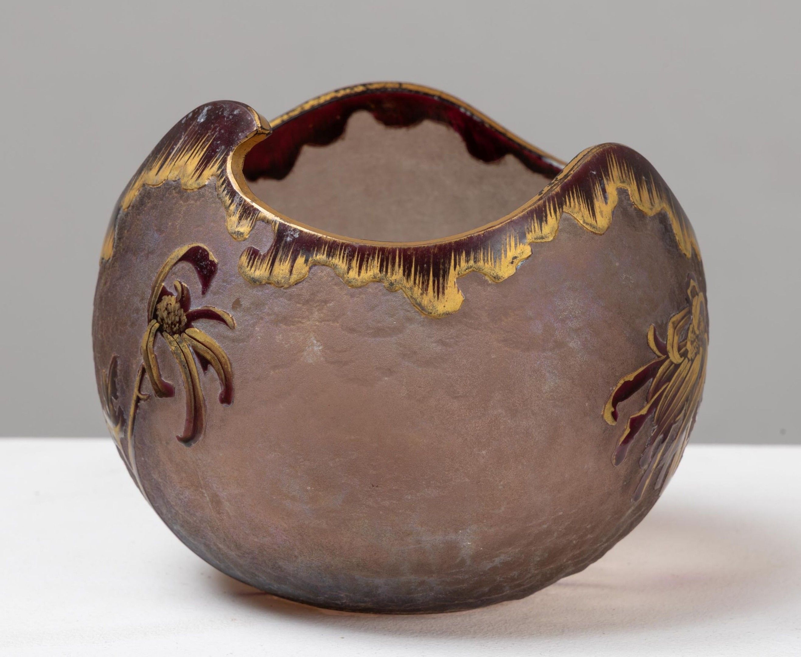 Coupe en verre émaillé et givré violet, à décor en relief de fleurs, rehauts d'or.