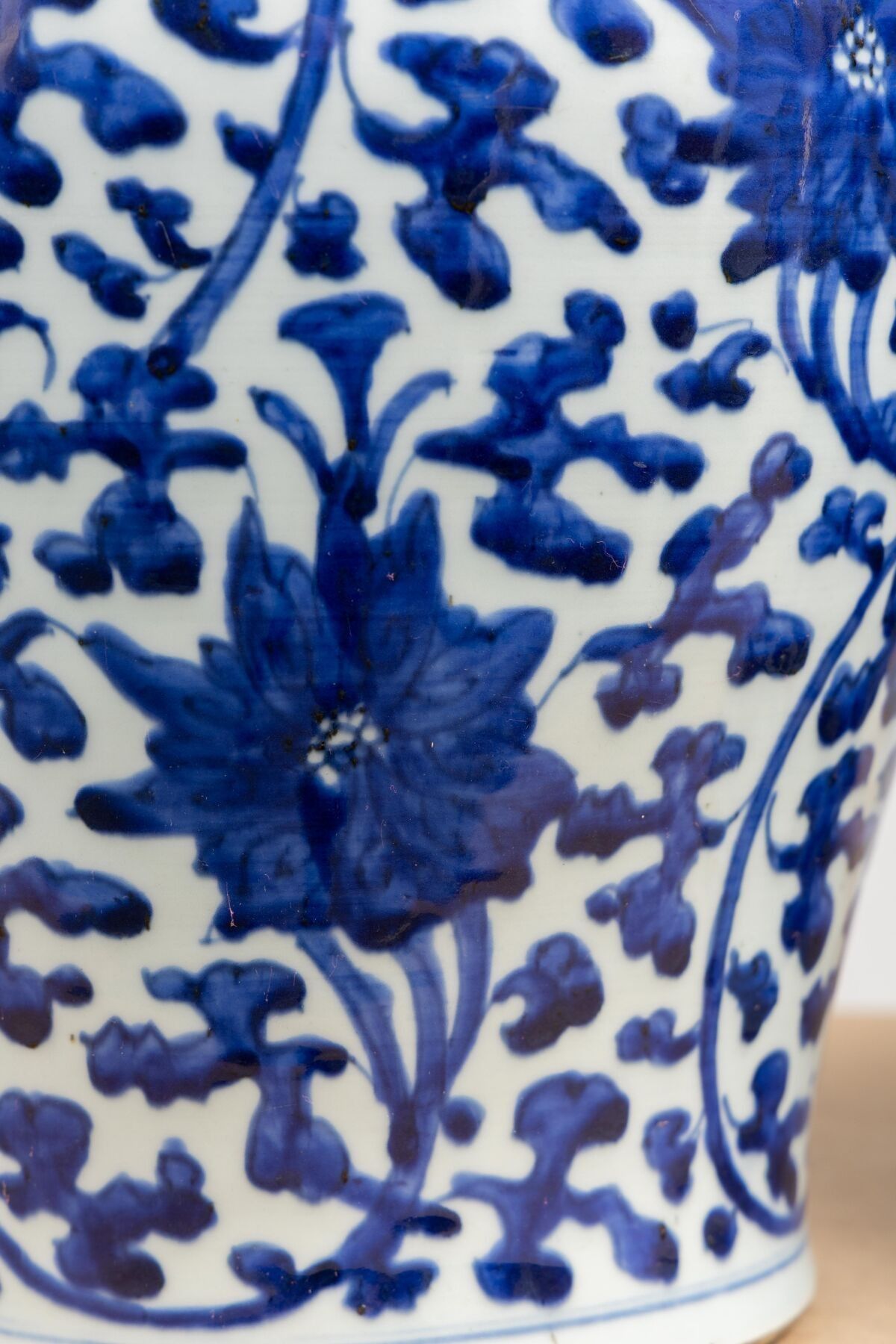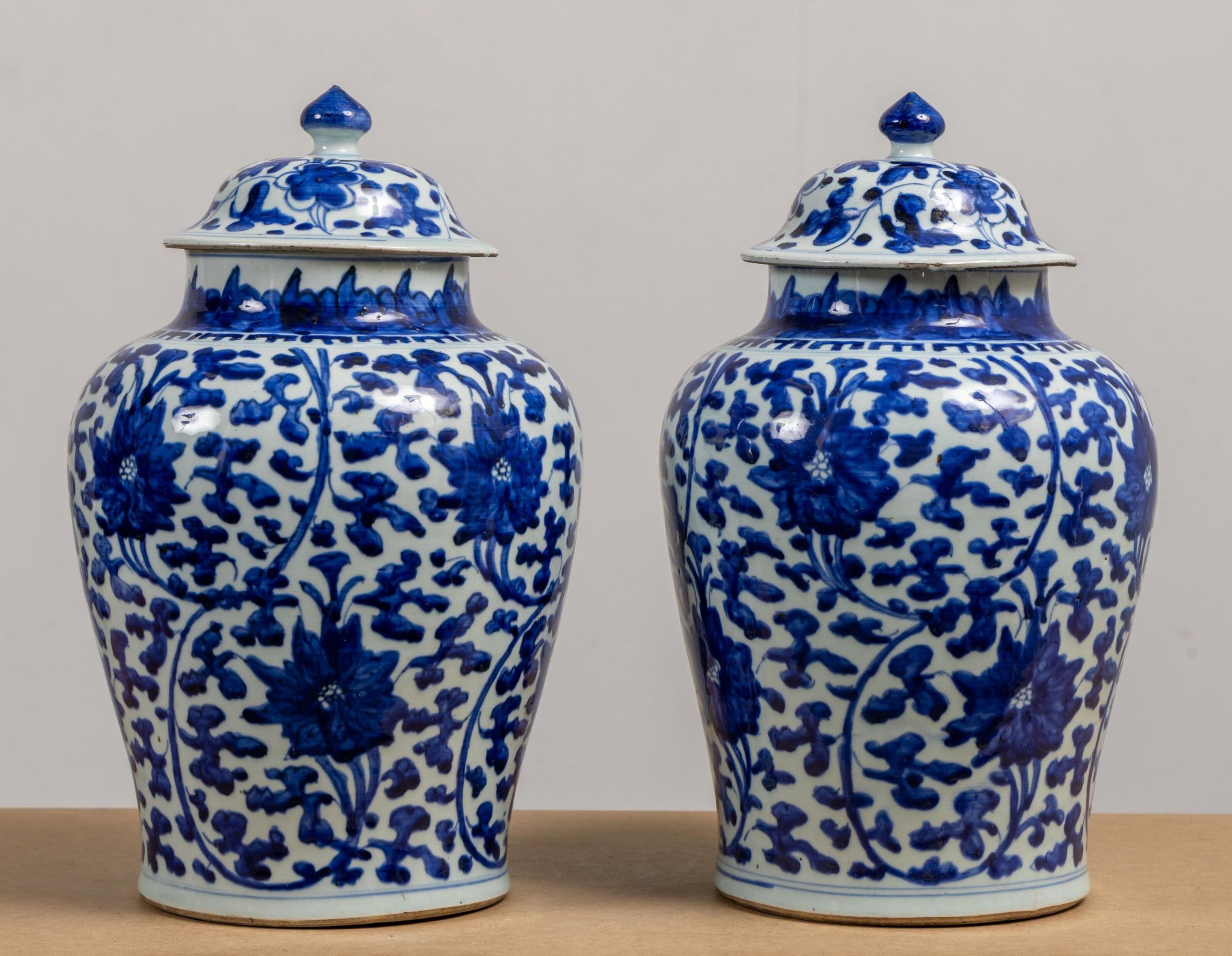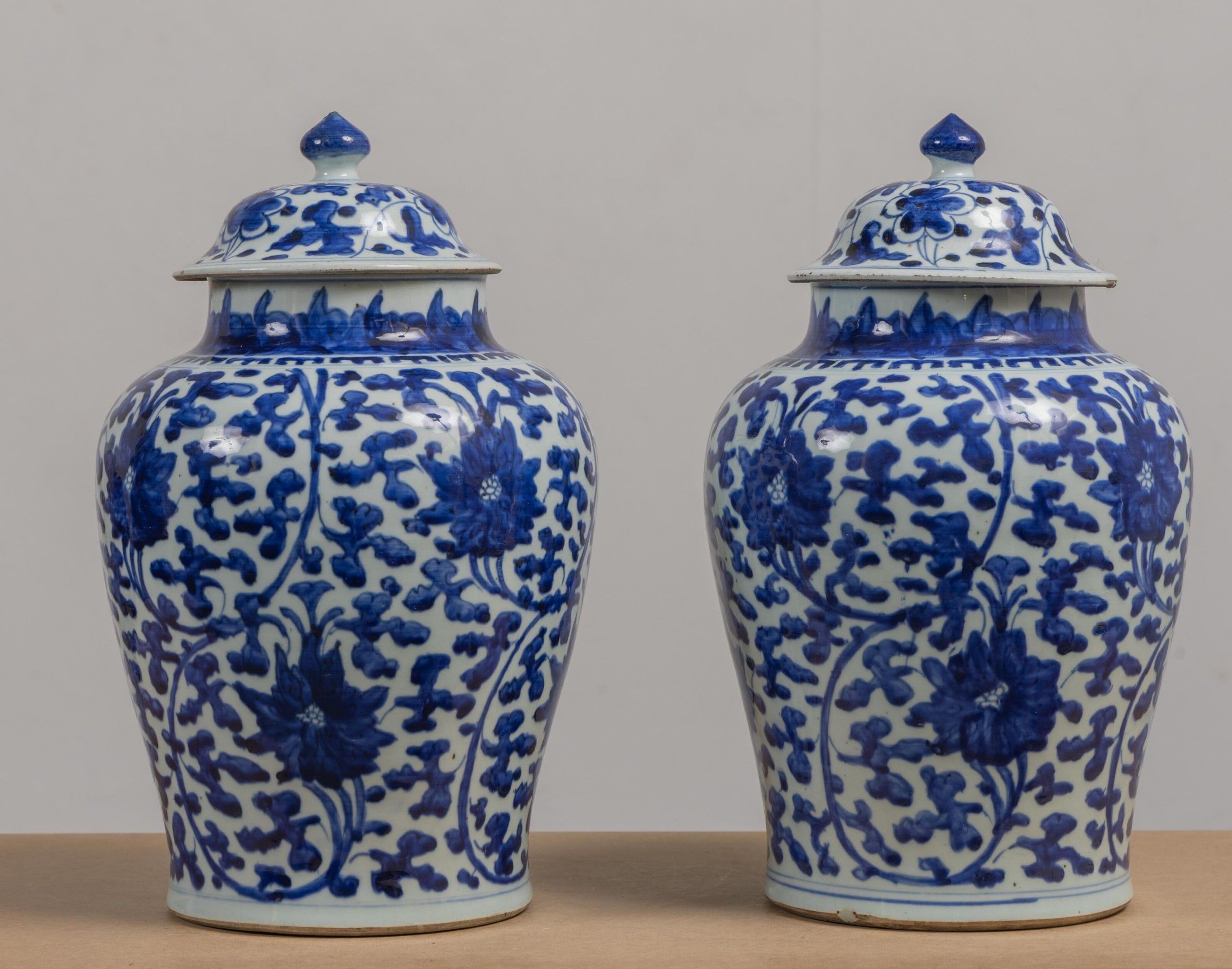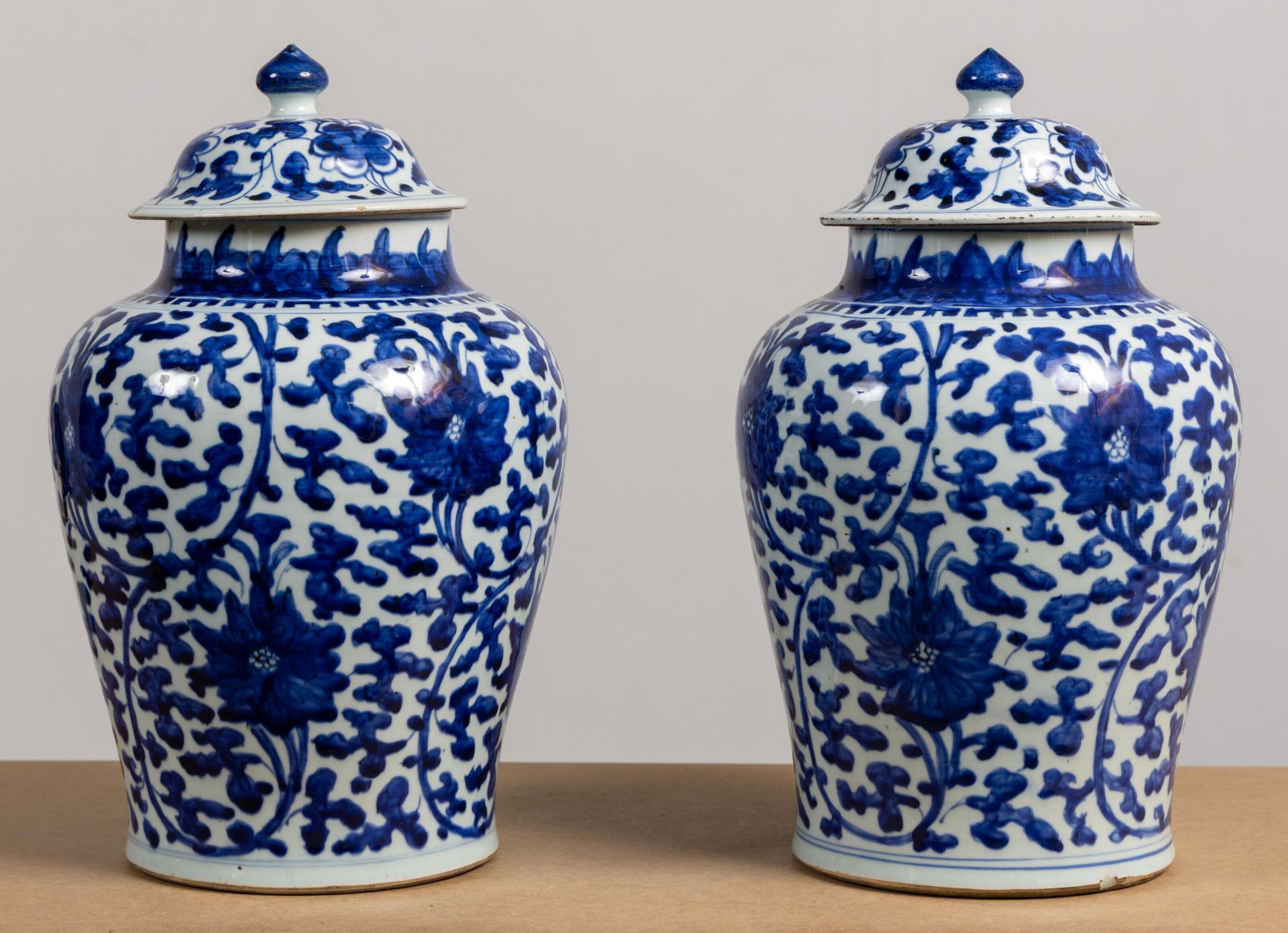 Paire de vases couverts en porcelaine à décor en camaïeu bleu de rinceaux fleuris et de feuillages.