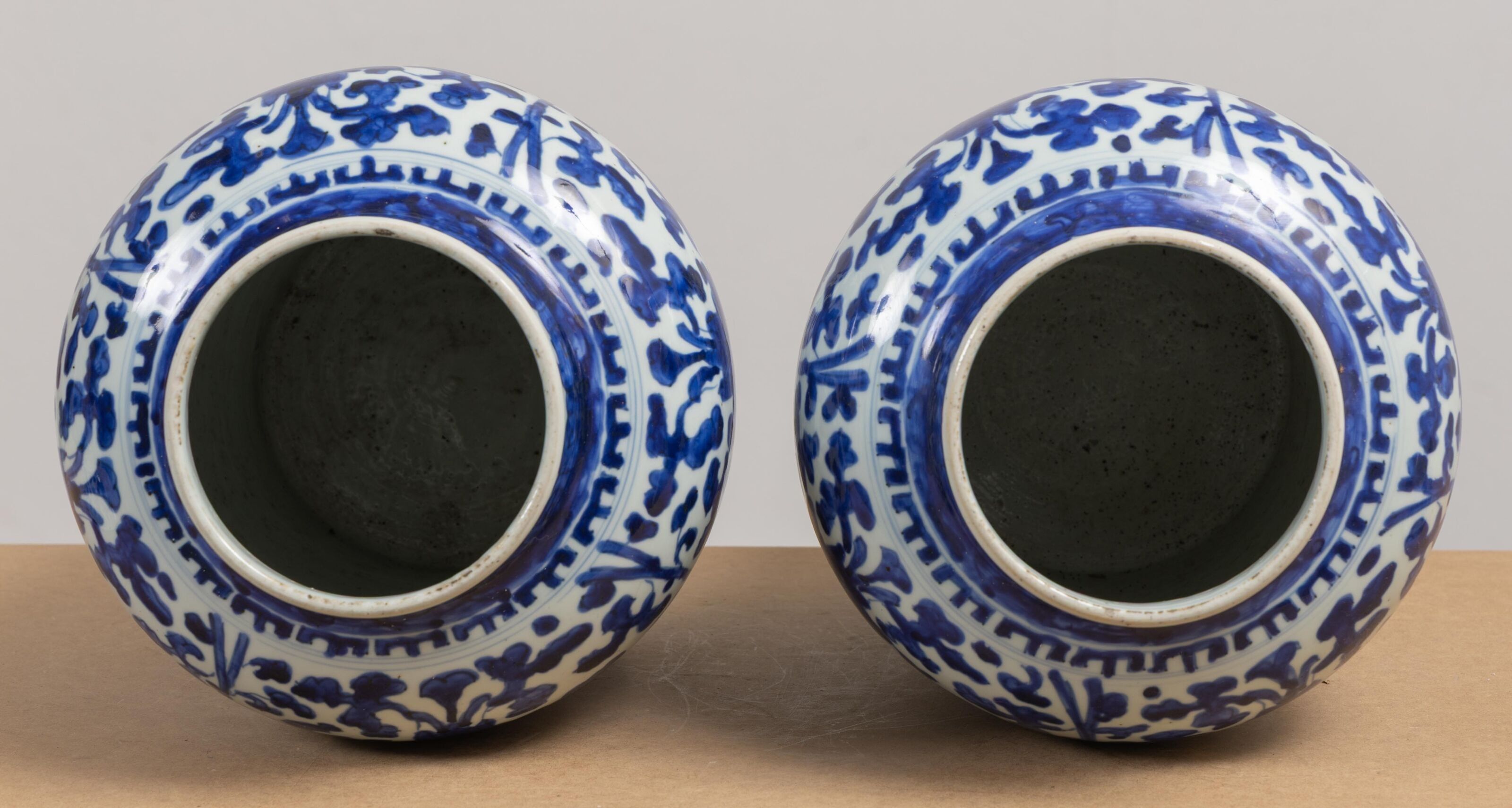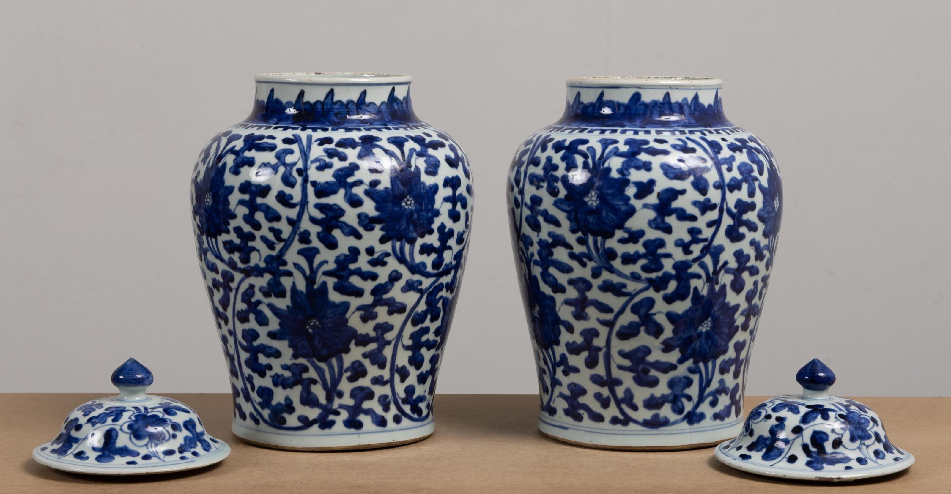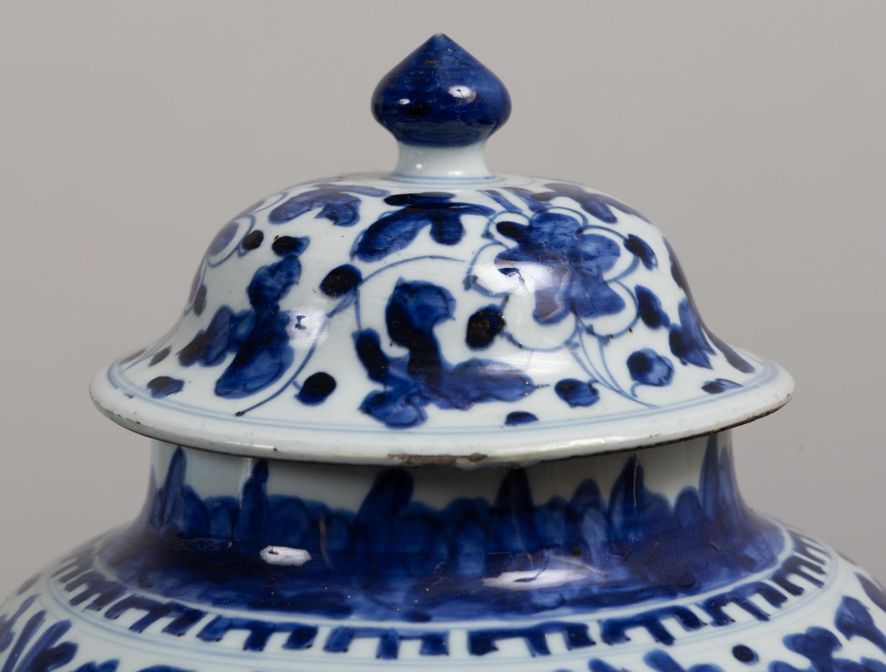 Paire de vases couverts en porcelaine à décor en camaïeu bleu de rinceaux fleuris et de feuillages.