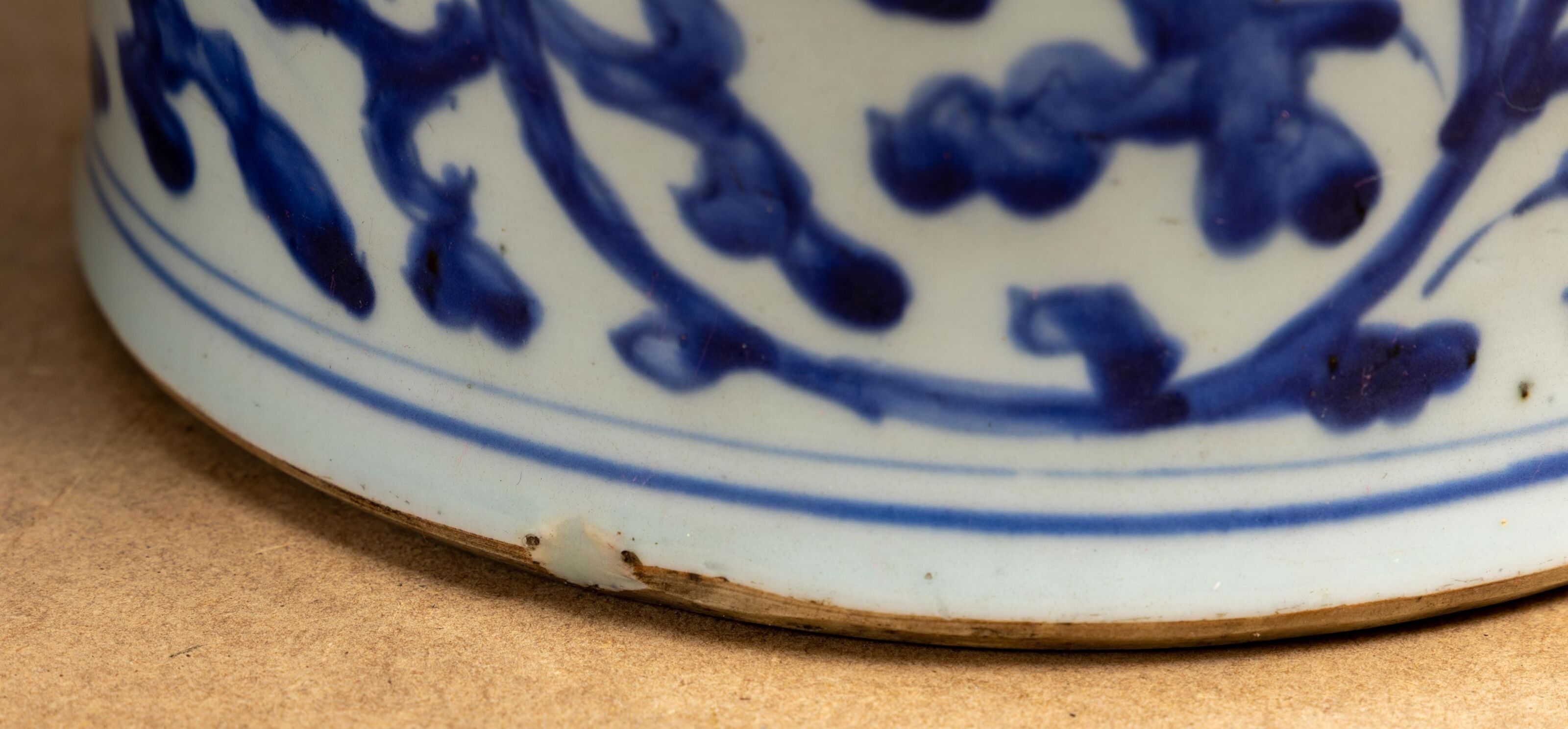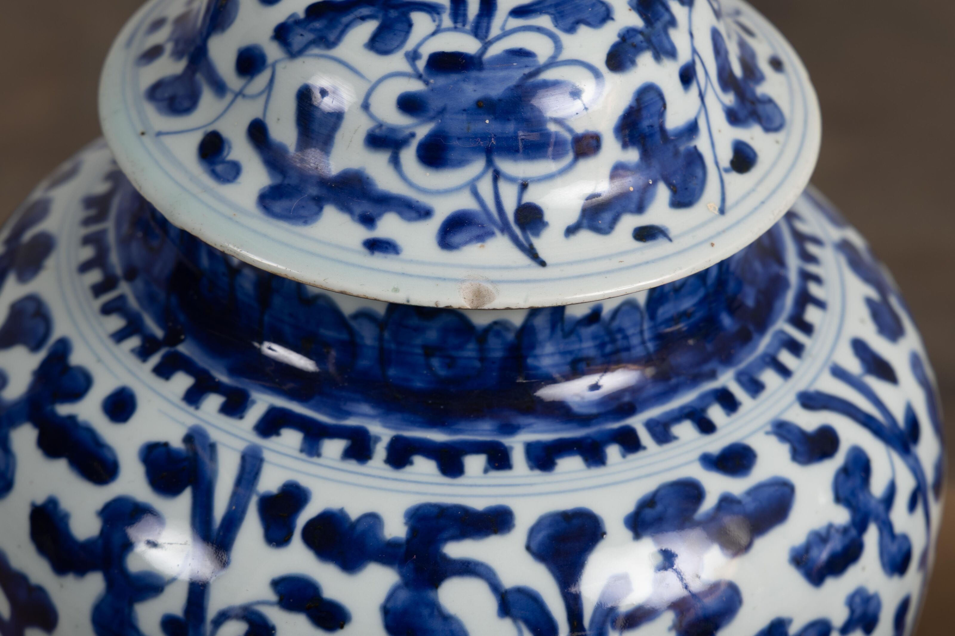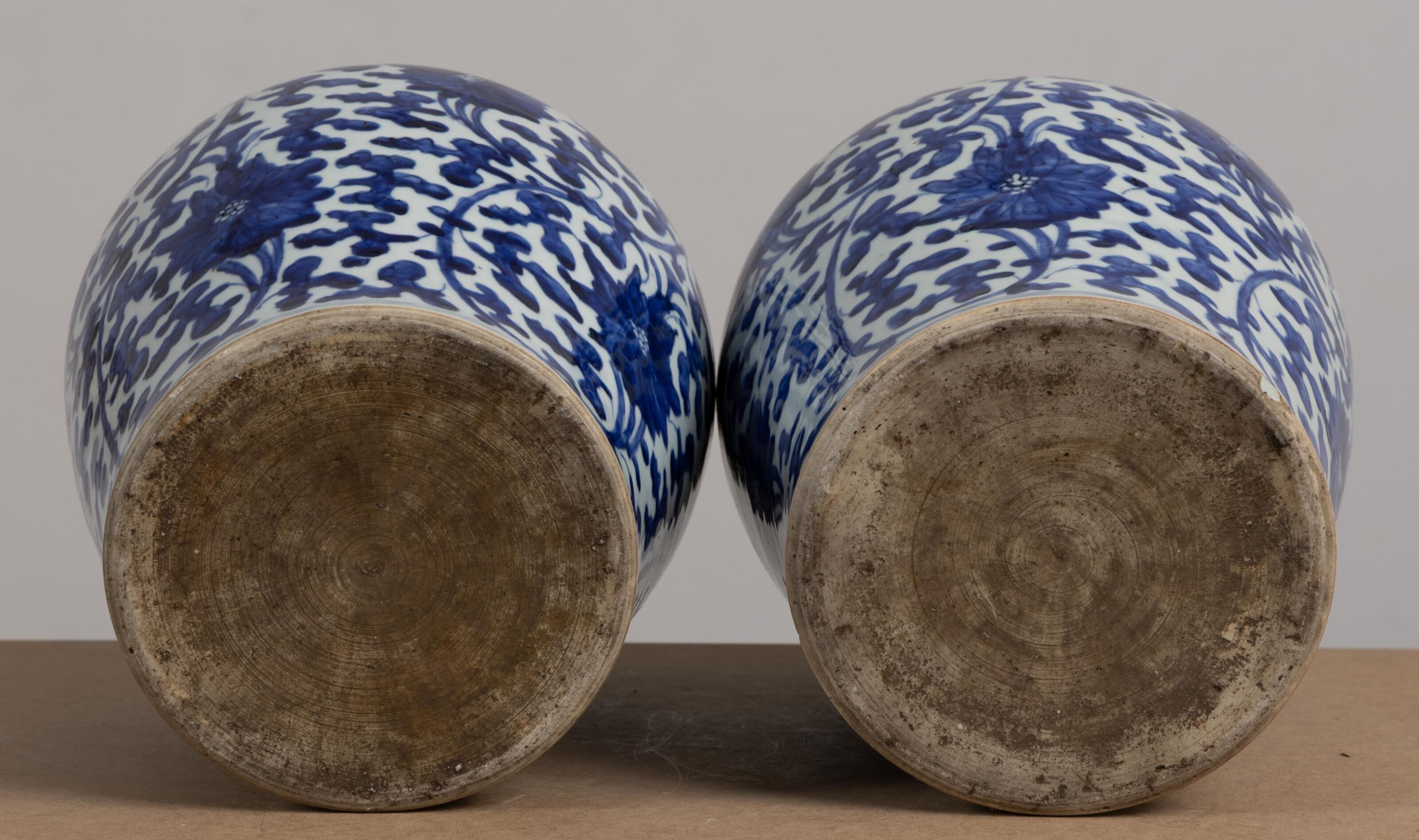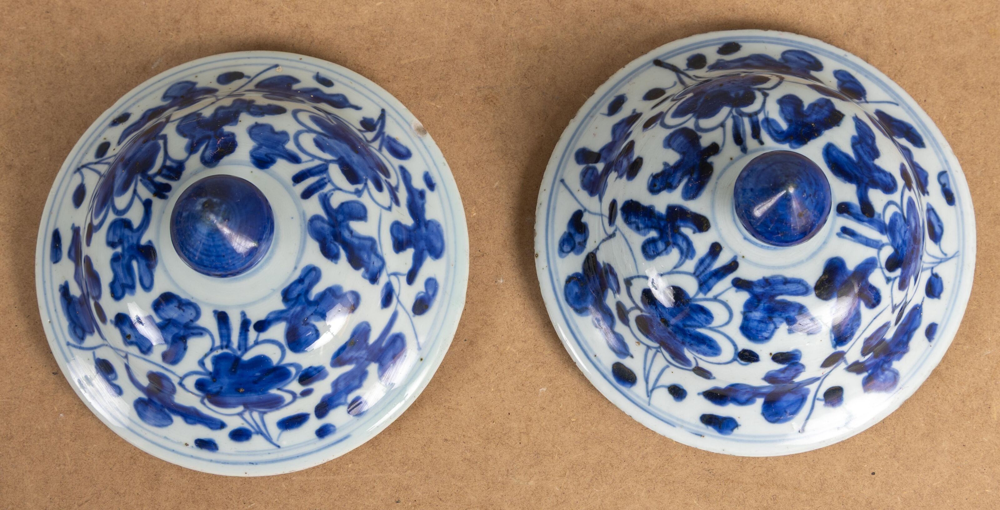 Paire de vases couverts en porcelaine à décor en camaïeu bleu de rinceaux fleuris et de feuillages.