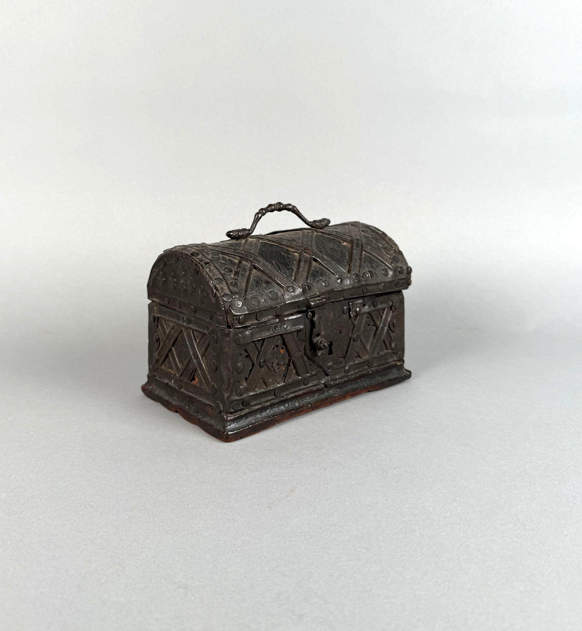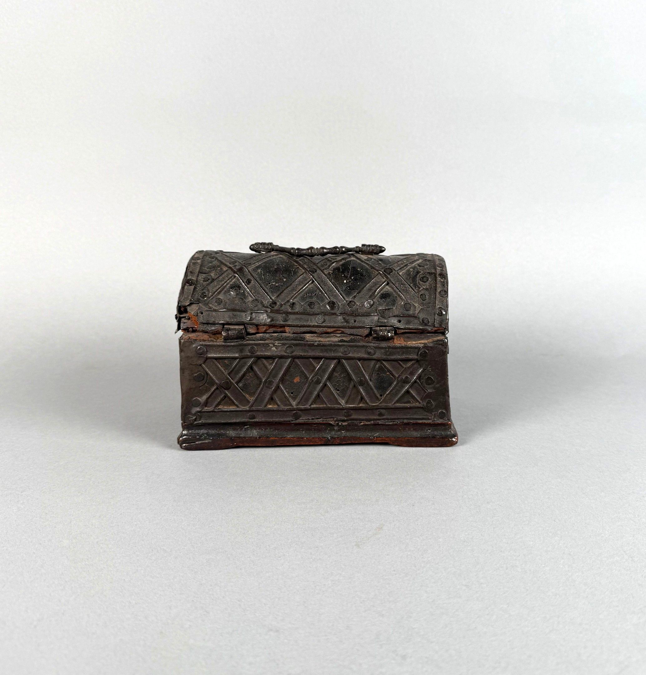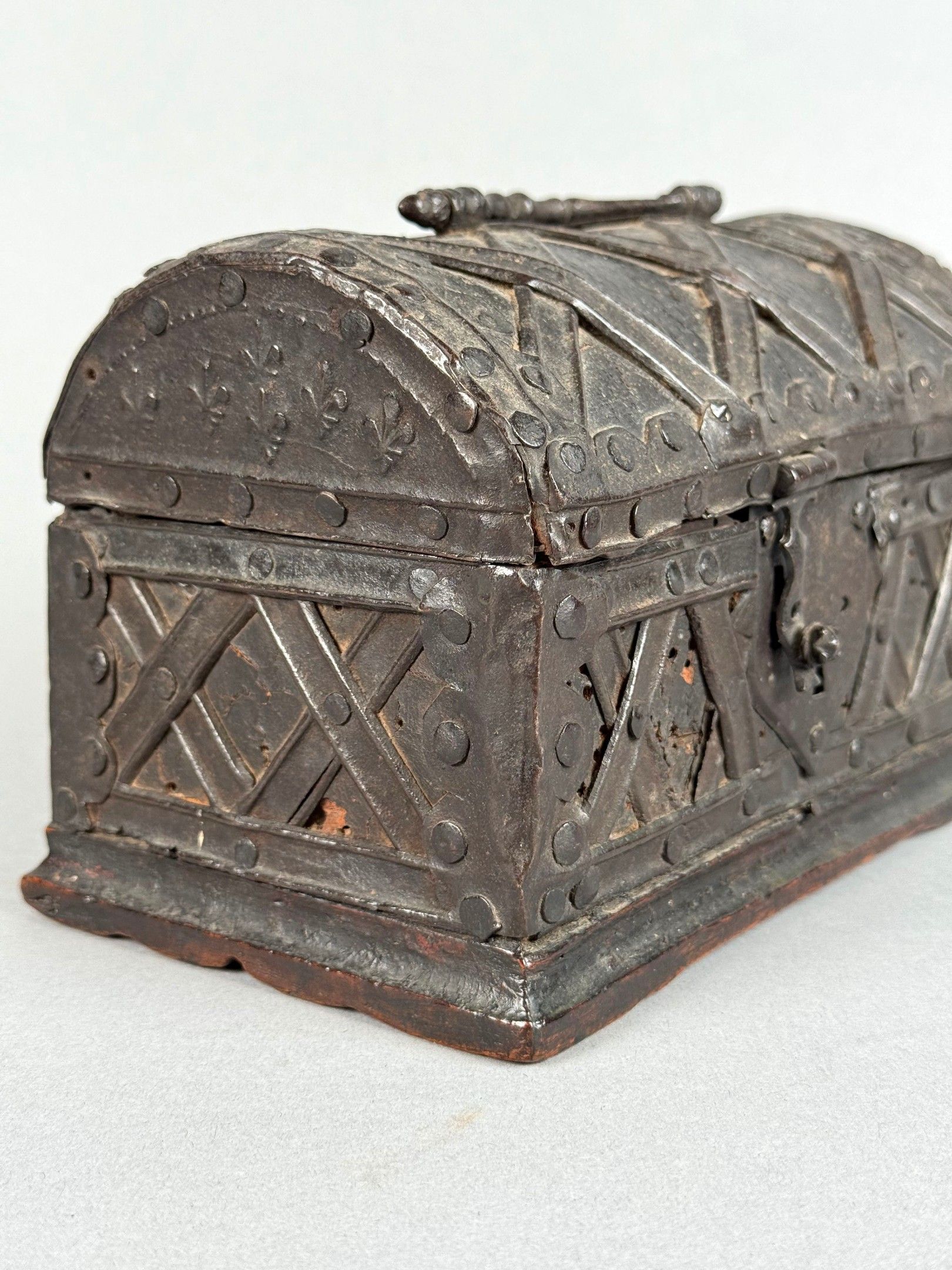 Coffret à âme en bois recouvert de cuir et de bandes en fer repoussé posées en croisillons, tympans des côtés ornés d’un semis de fleurs de lys ; base moulurée ; serrure à moraillon et poignée sommitale.