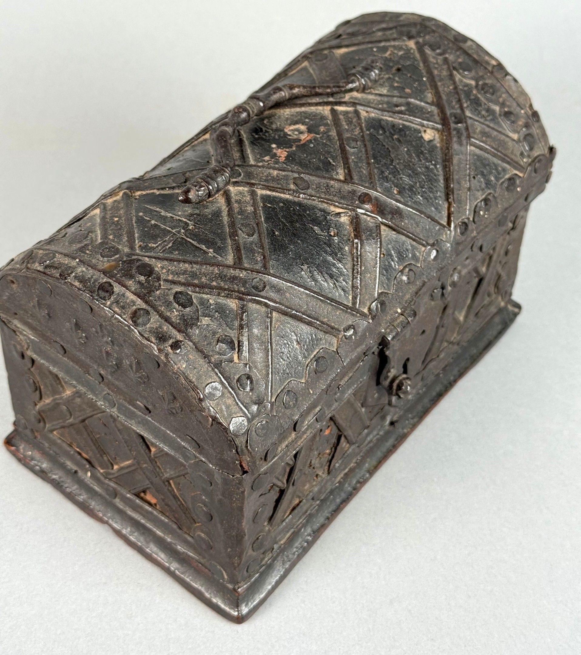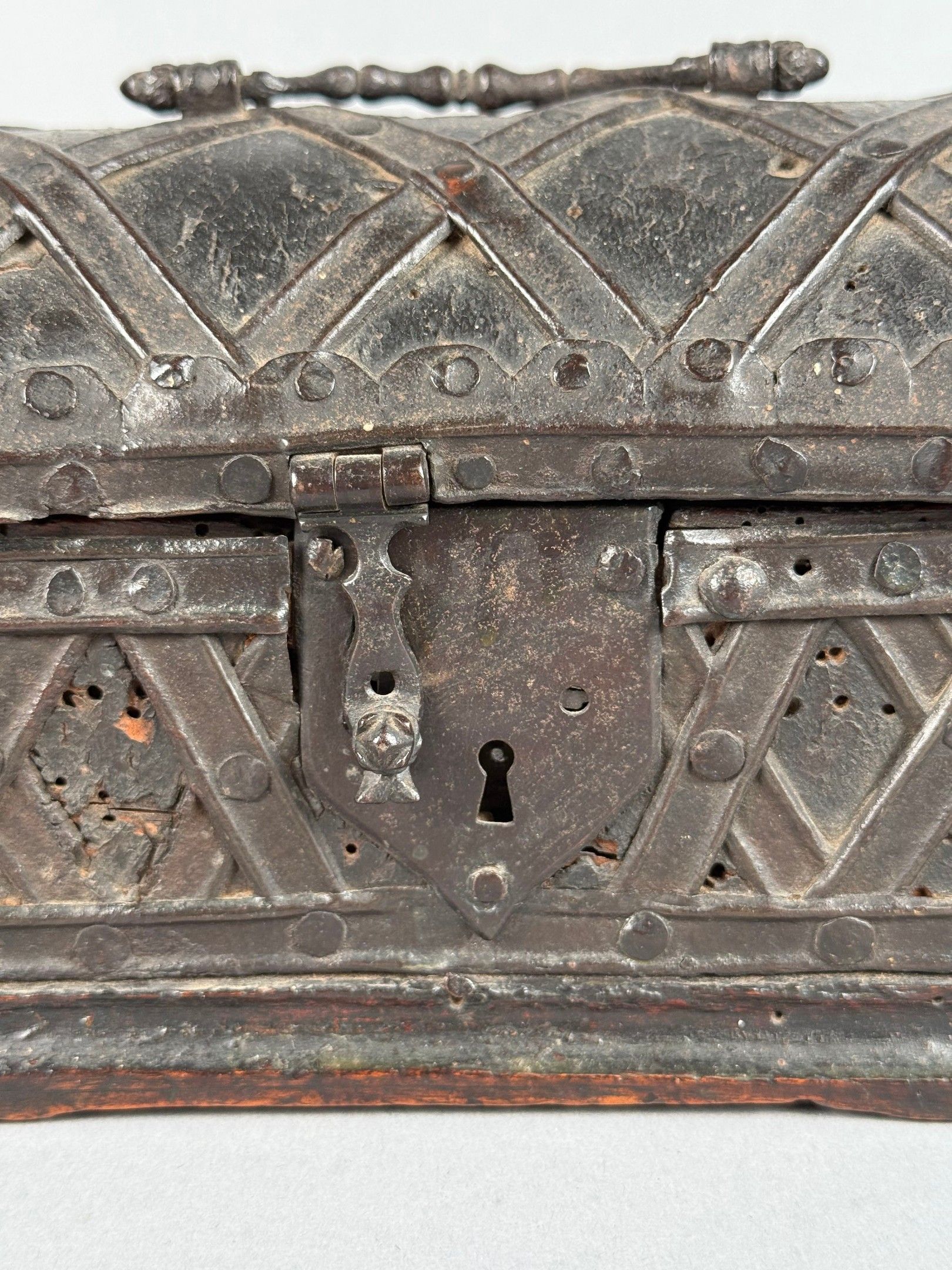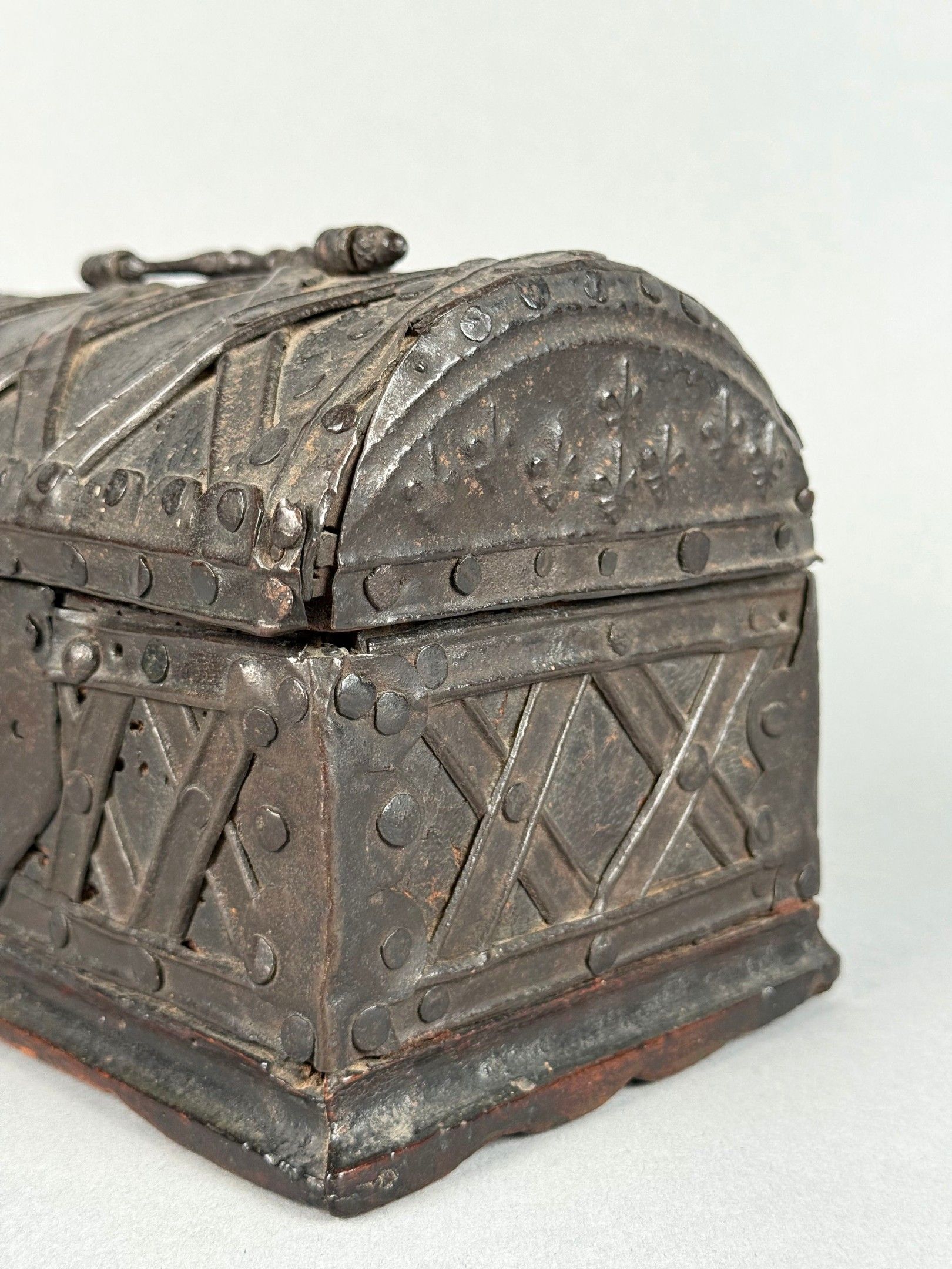 Coffret à âme en bois recouvert de cuir et de bandes en fer repoussé posées en croisillons, tympans des côtés ornés d’un semis de fleurs de lys ; base moulurée ; serrure à moraillon et poignée sommitale.