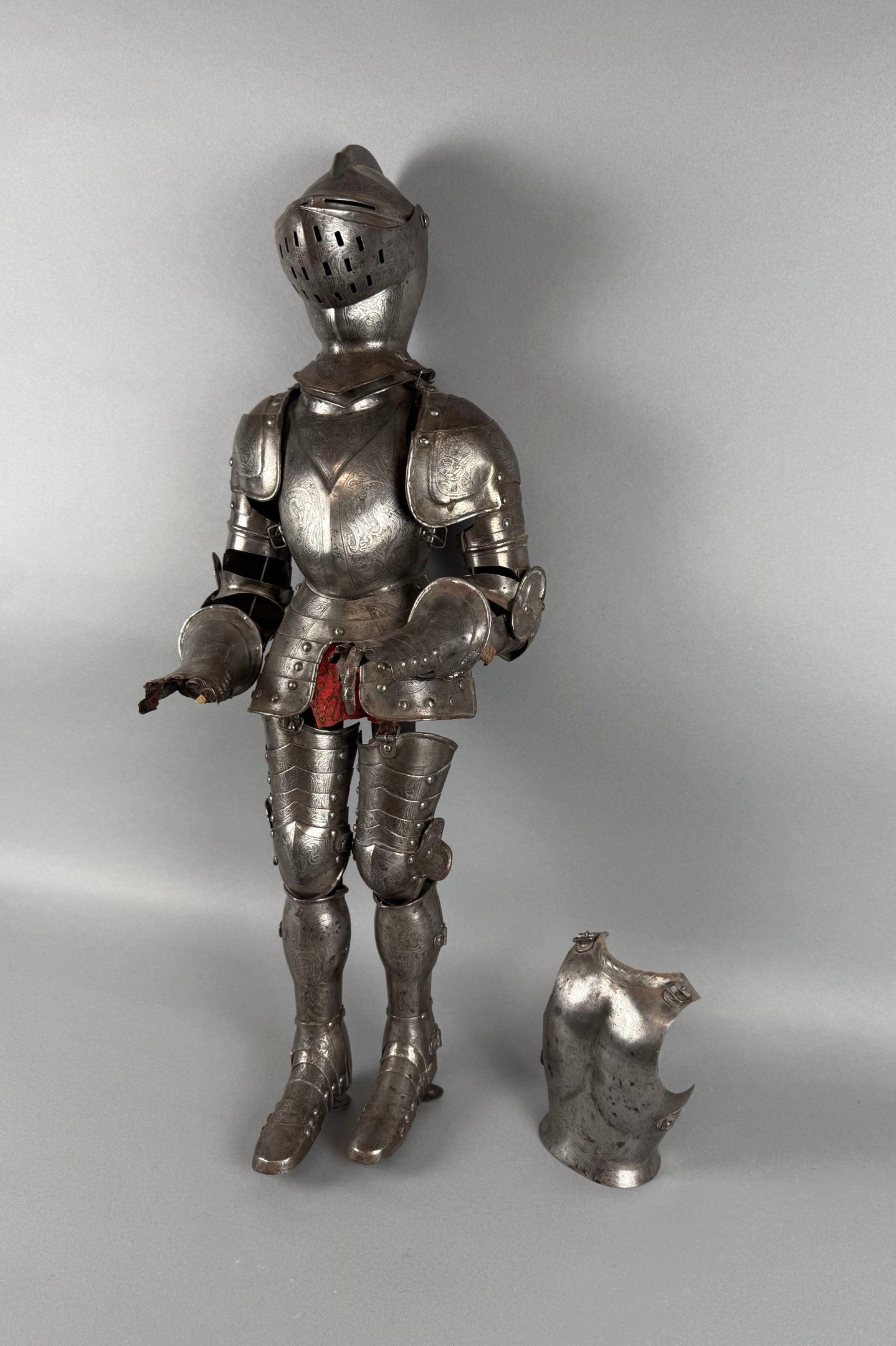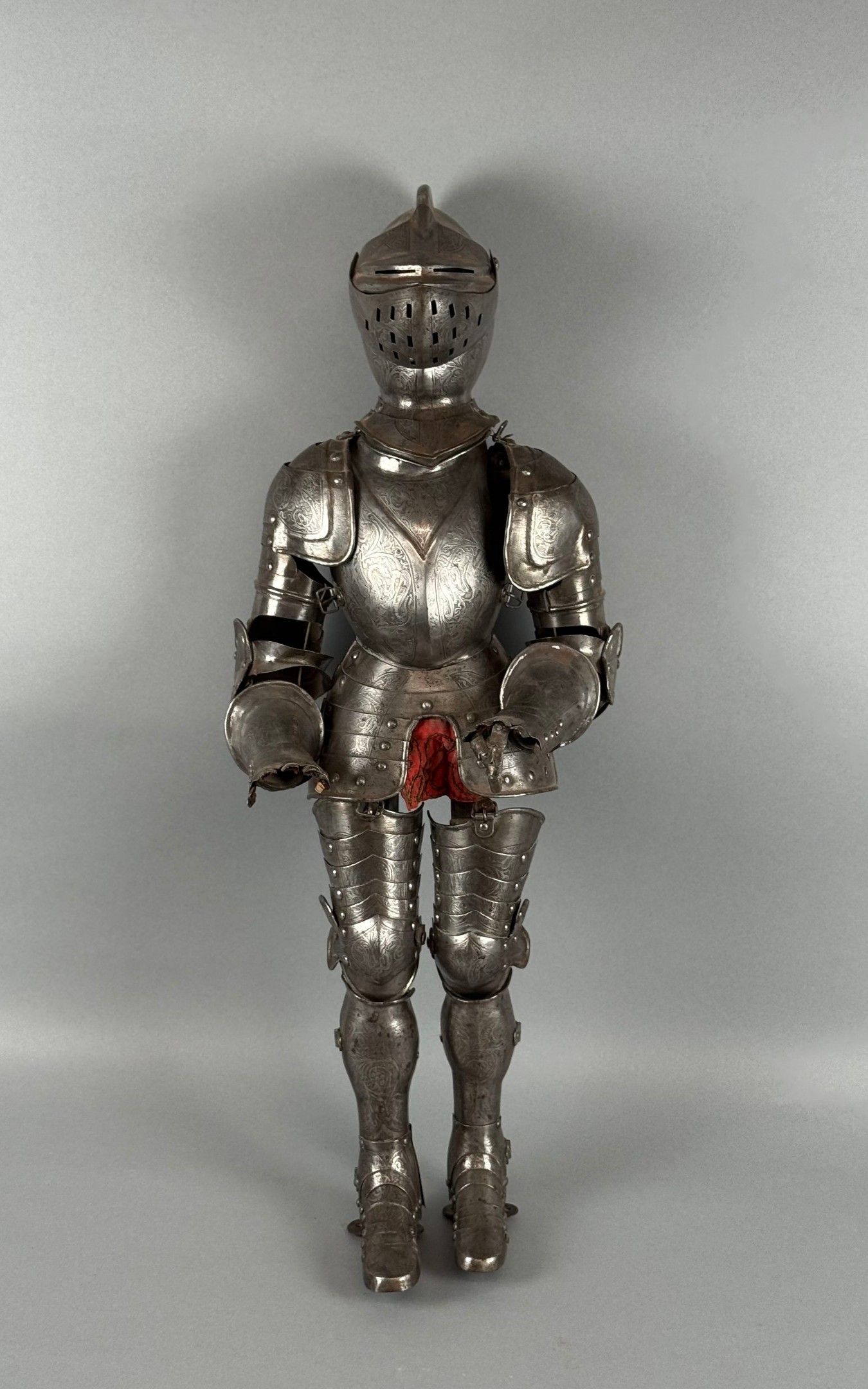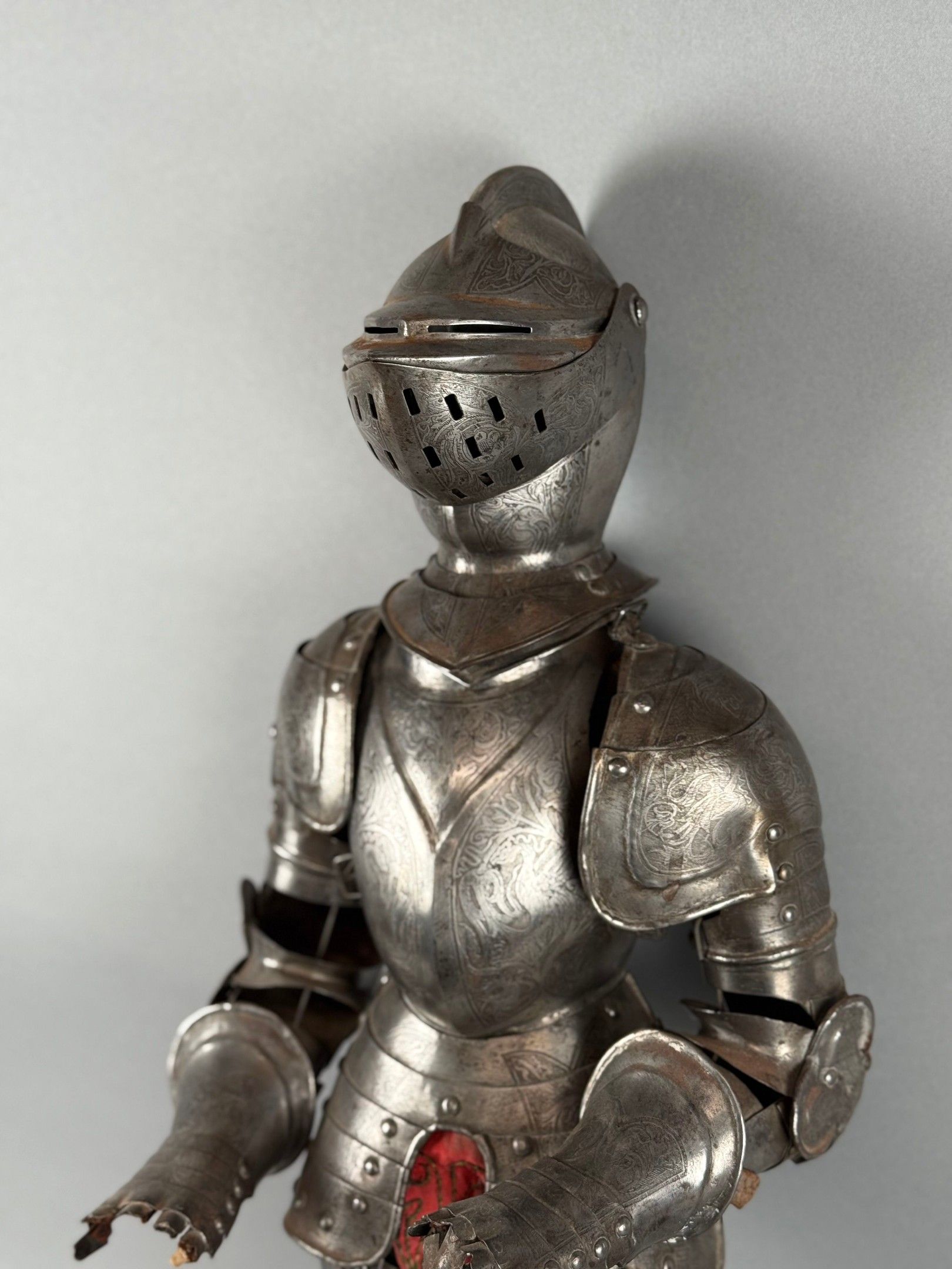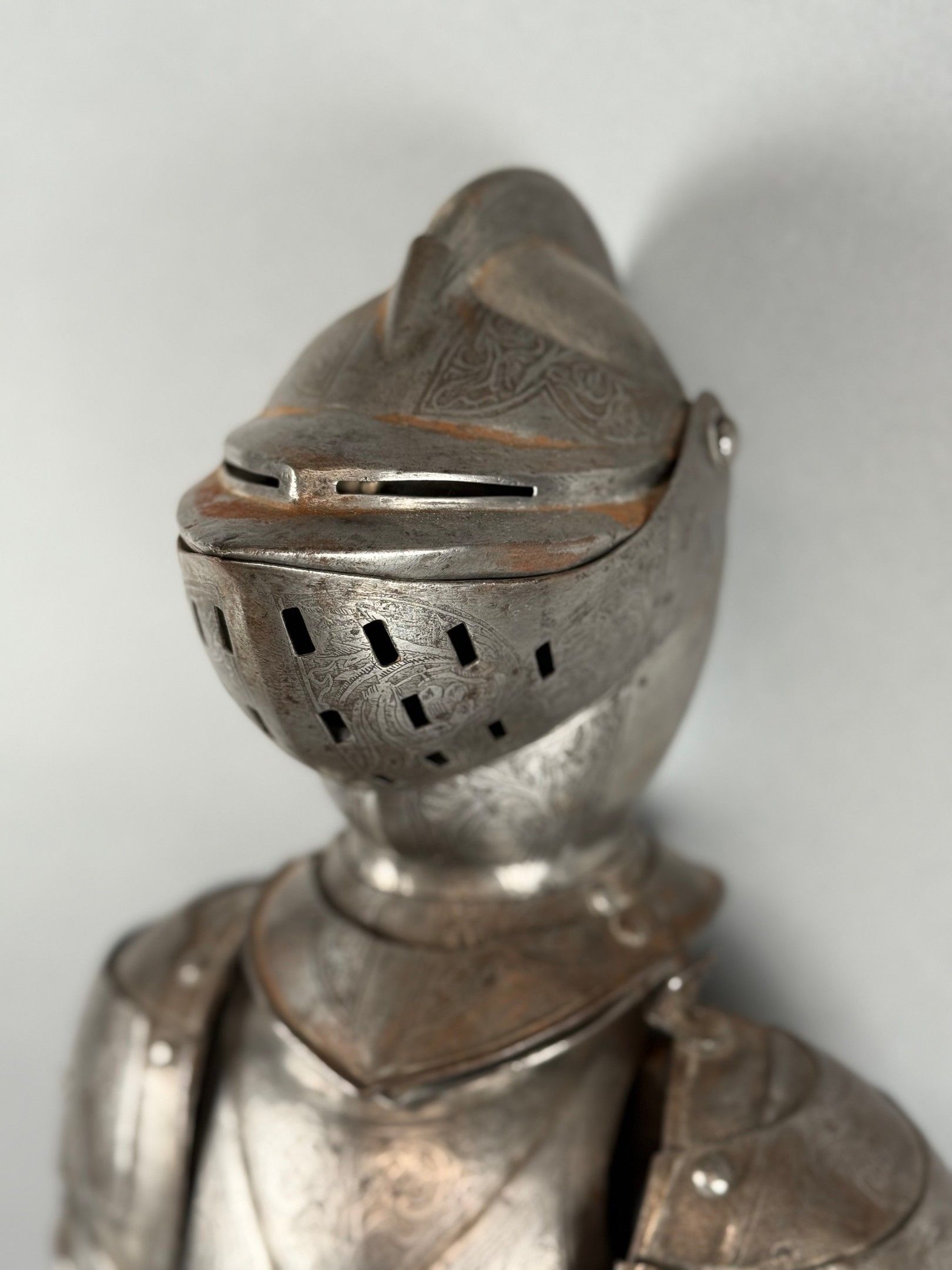 Armure en réduction Armet en proue de navire. Gravures à l’eau-forte à décor végétal. Époque fin XIXe. Bon état. Hauteur : 72 cm