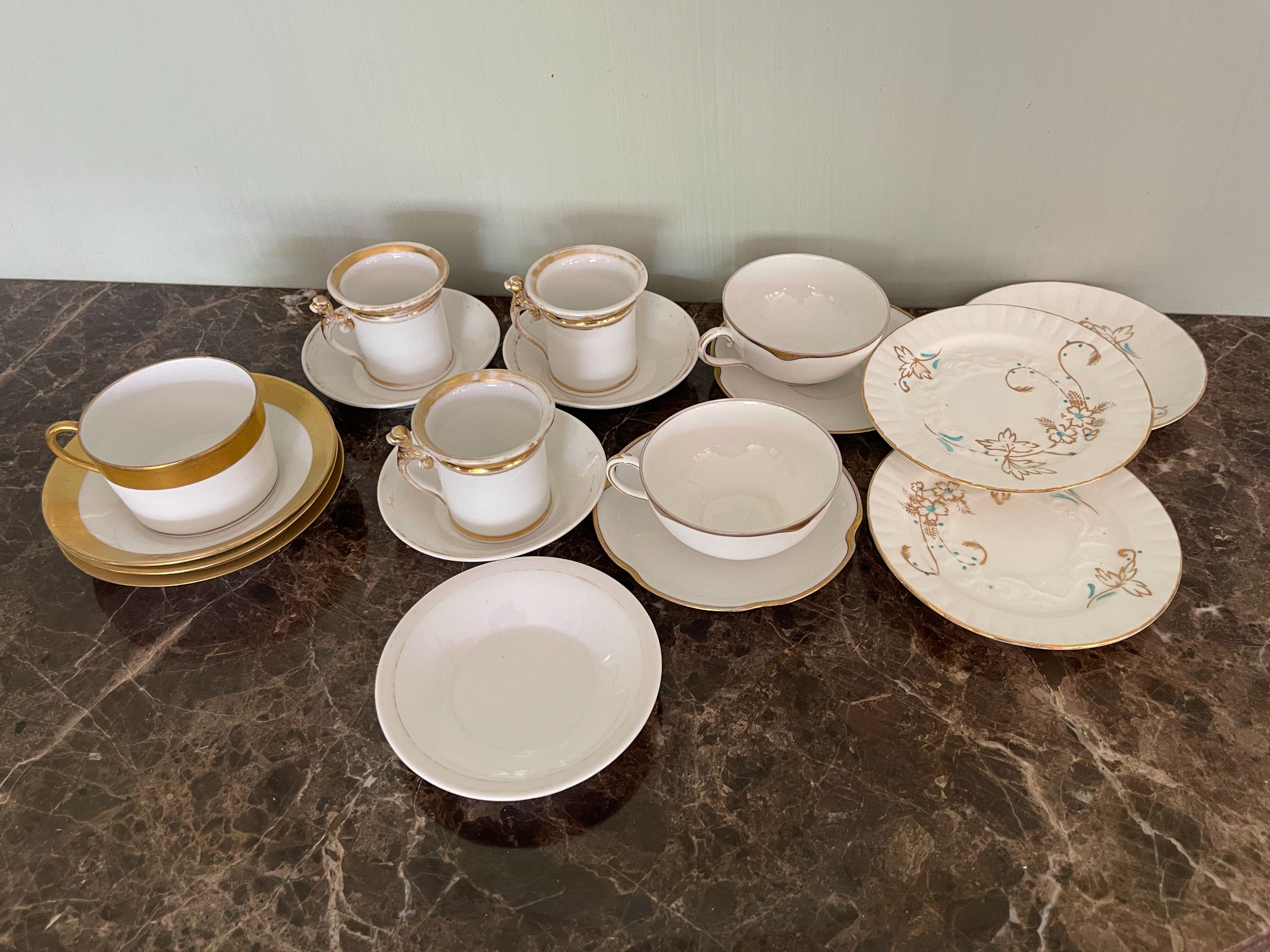 Onze tasses, douze sous-tasses en porcelaine blanche et or, XIXe s., usures