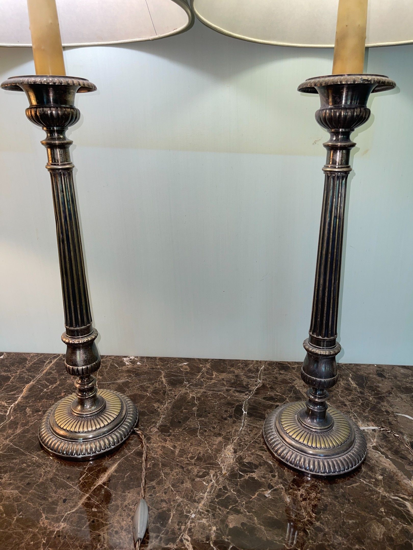 Paire de pieds de lampe en métal argenté, cannelés et godronnés Petits accidents, vendus sans abat jour A PRENDRE A GENNEVILLIERS