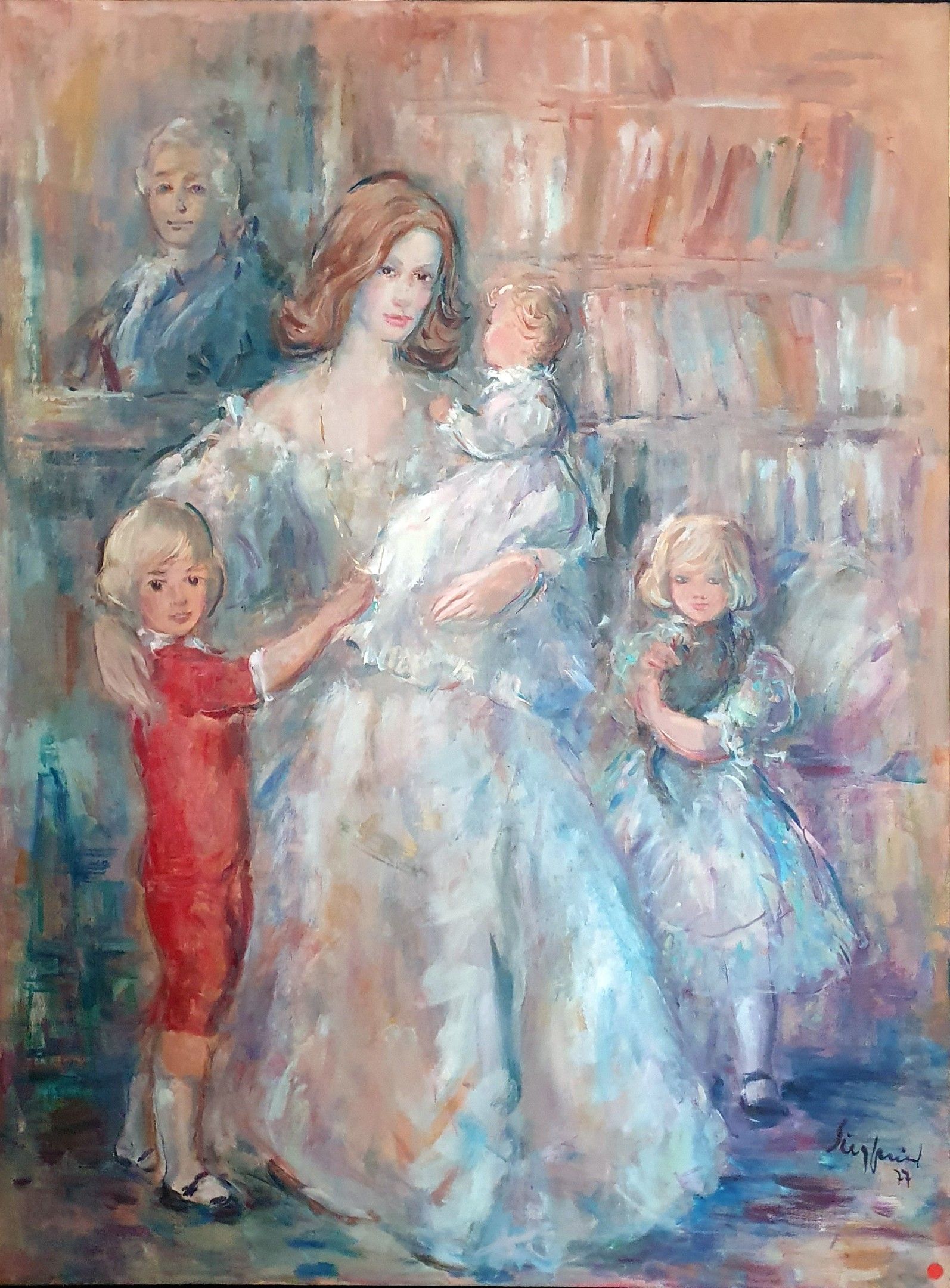 Ecole moderne Jeune femme et ses enfants Huile sur toile, signée et datée 77 en bas à droite 130 x 97 cm