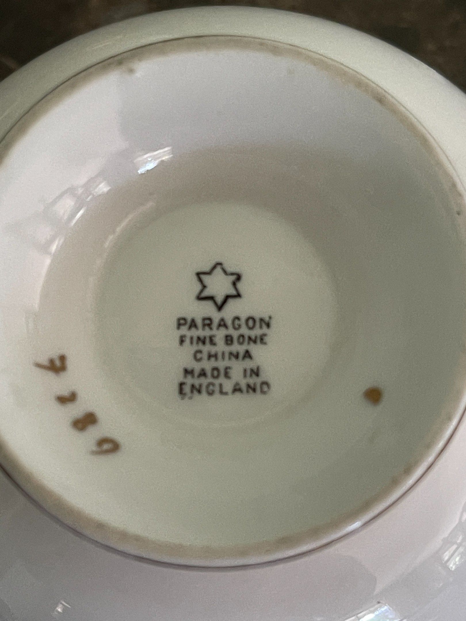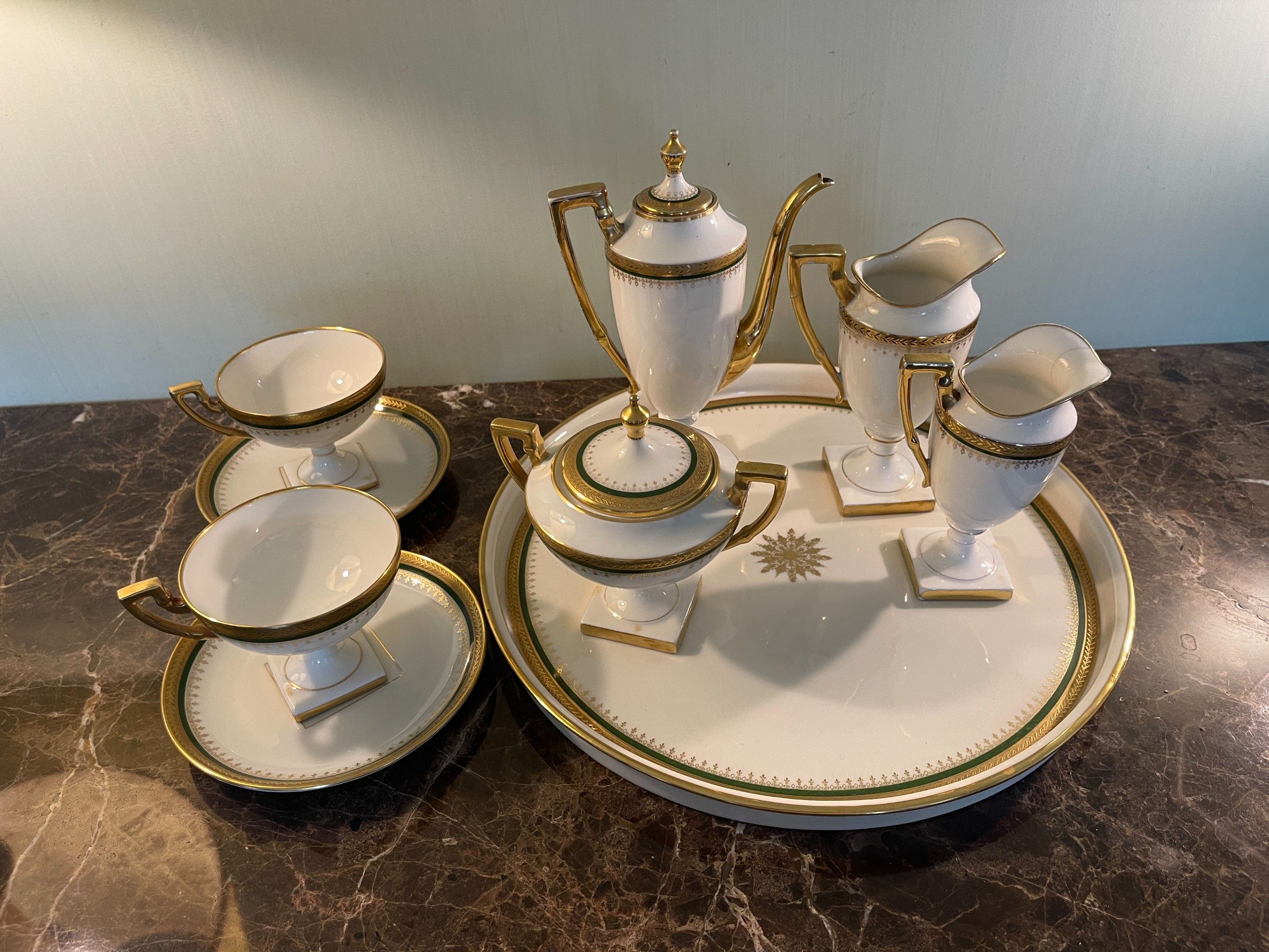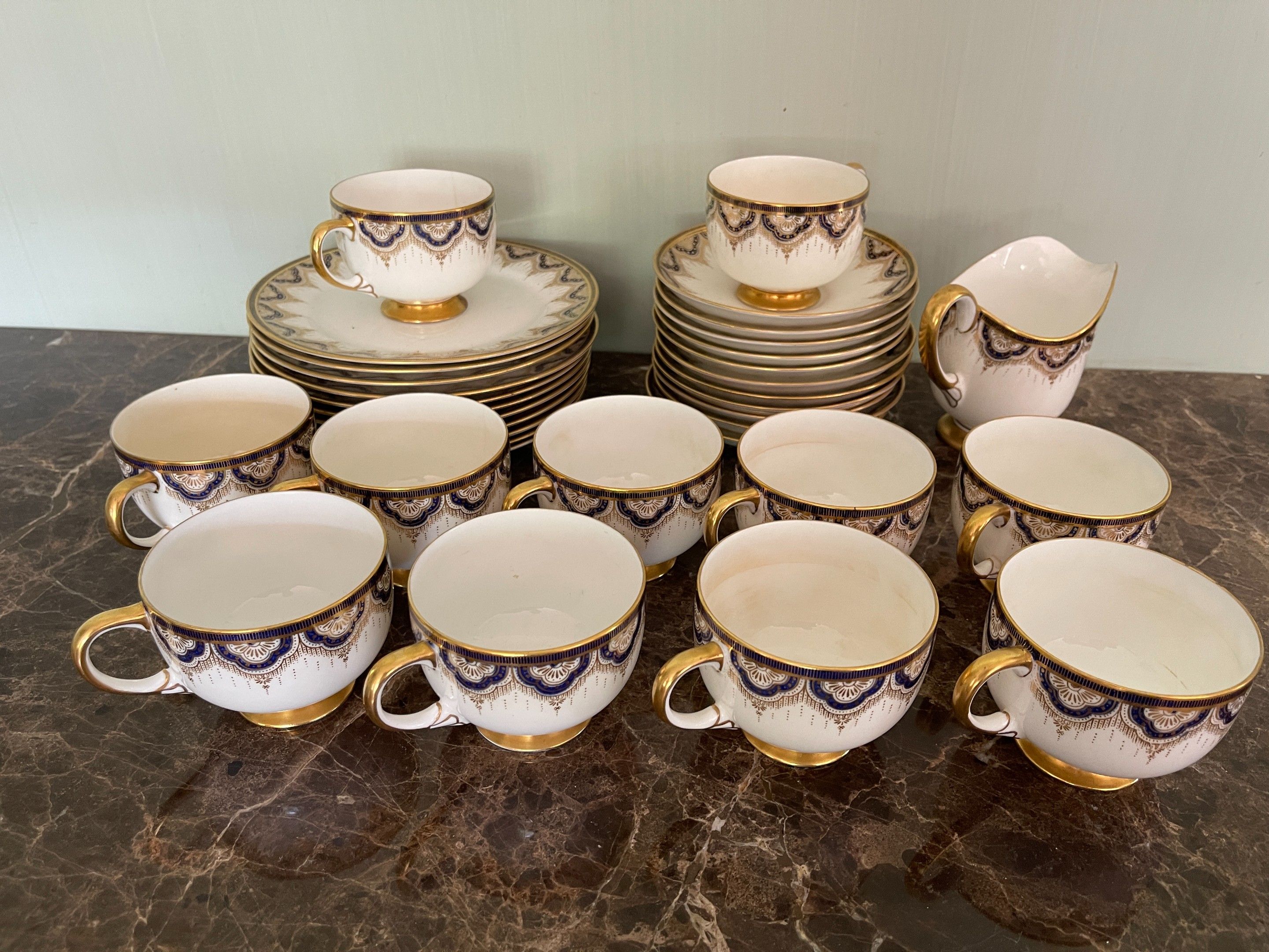 Partie de service à thé en porcelaine à décor bleu de four et or, Angleterre, travail moderne comprenant un pot à lait, onze assiettes à gâteaux, onze tasses et sous-tasses à thé (une tasse fêlée); on y joint un cabaret en porcelaine blanche à filets or et verts, comprenant un plateau, deux tasses et sous-tasses, un sucrier, une cafetière (accident), un pot à eau (accidents), pot à lait (accidents)