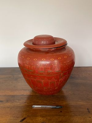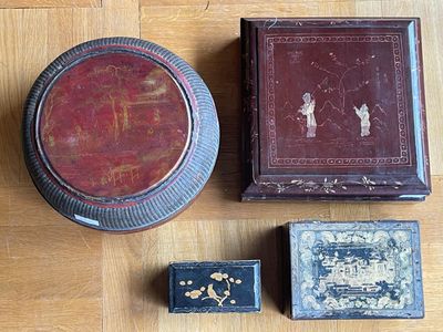 Lot comprenant: - boite en laque rouge, style birman, H.: 32…