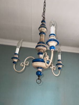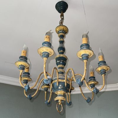 Petit lustre en bois et métal à trois lumières et une appliq…