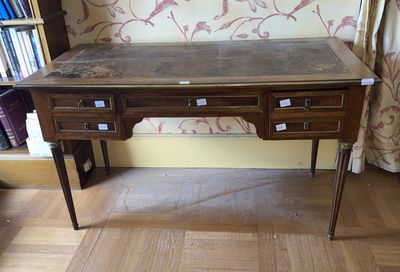 Bureau plat en bois de placage ouvrant à quatre tiroirs pour…