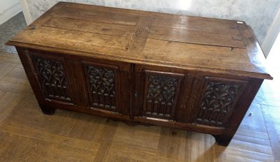 Coffre en chêne naturel mouluré et sculpté à décor, ouvrant …