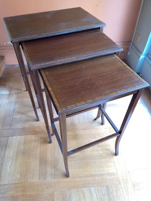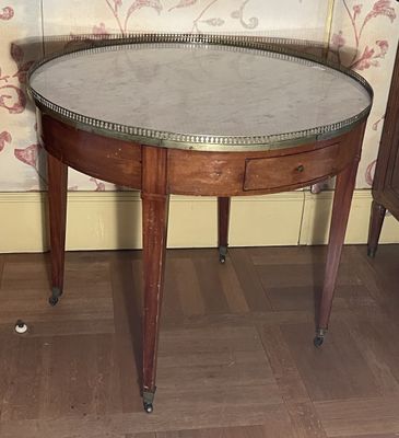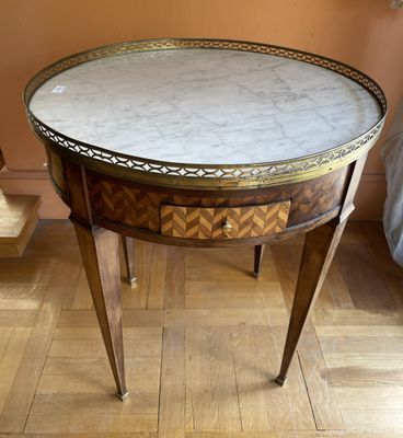 Table bouillotte en bois de placage et filet de marqueterie,…