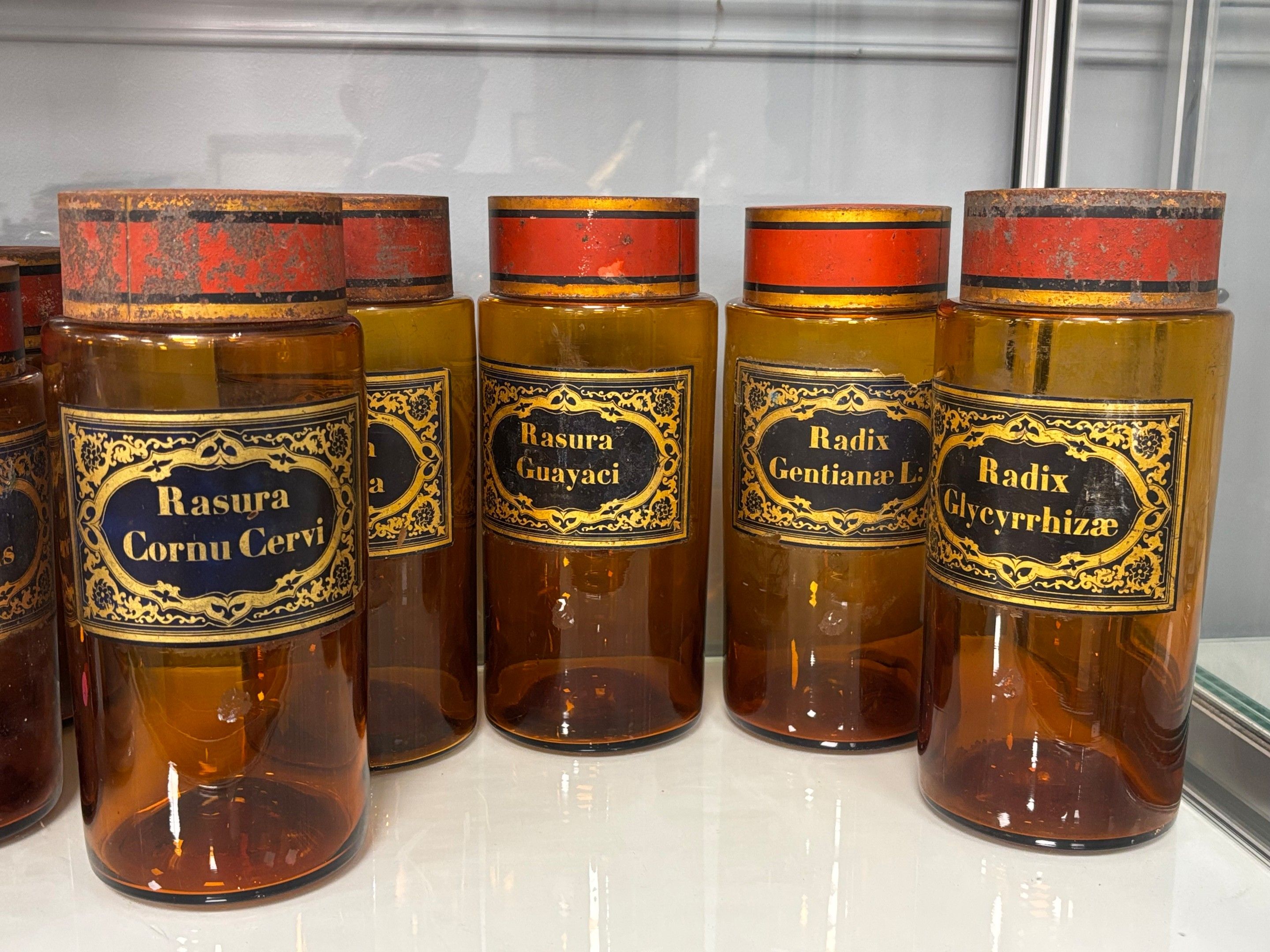 LOT de 5 pots de pharmacie en verre ambré et couvercle en métal peint