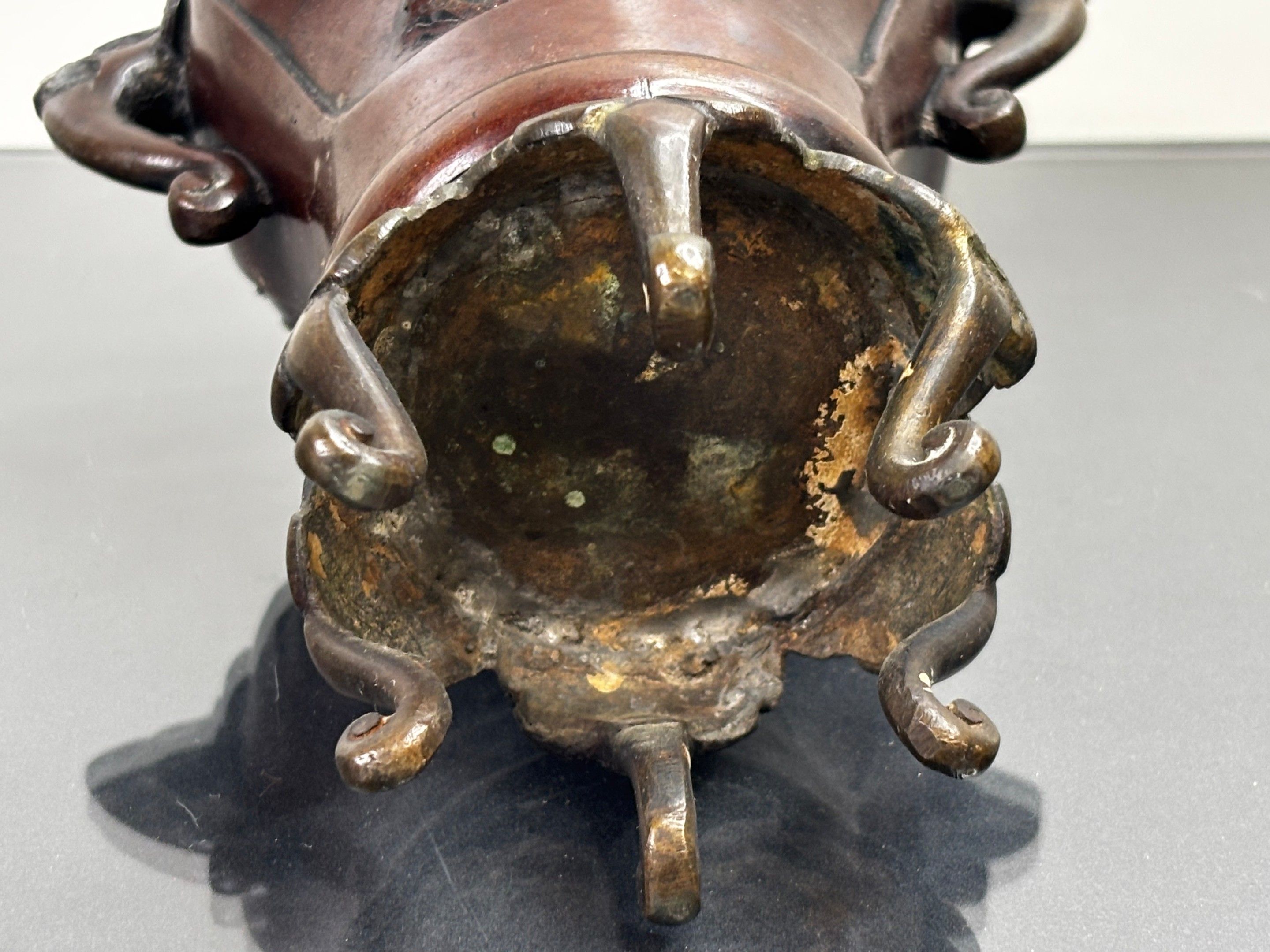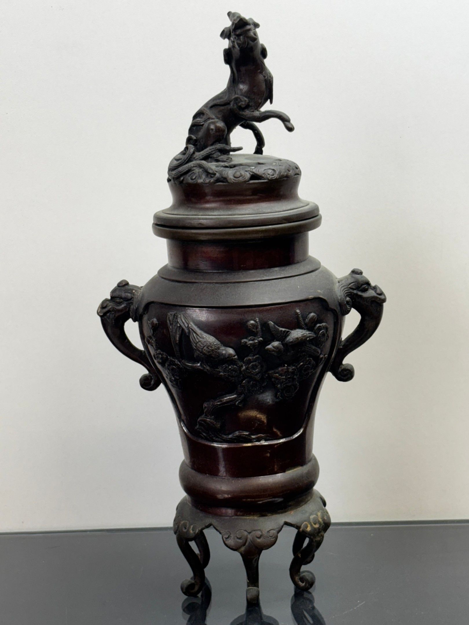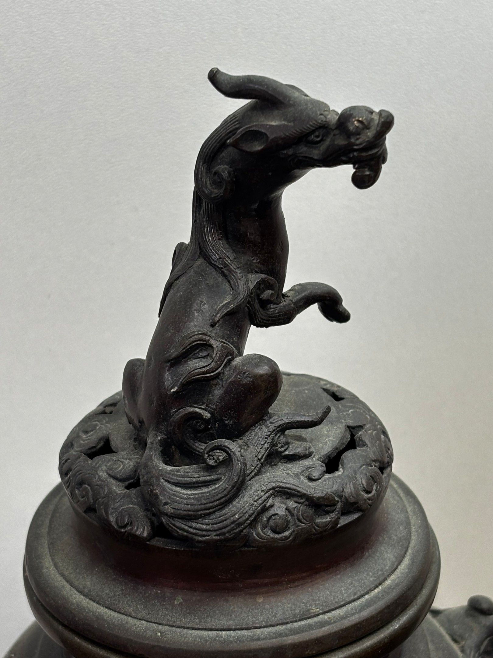 BRULE-PARFUM en bronze patiné surmonté d'un chien de Fô.
