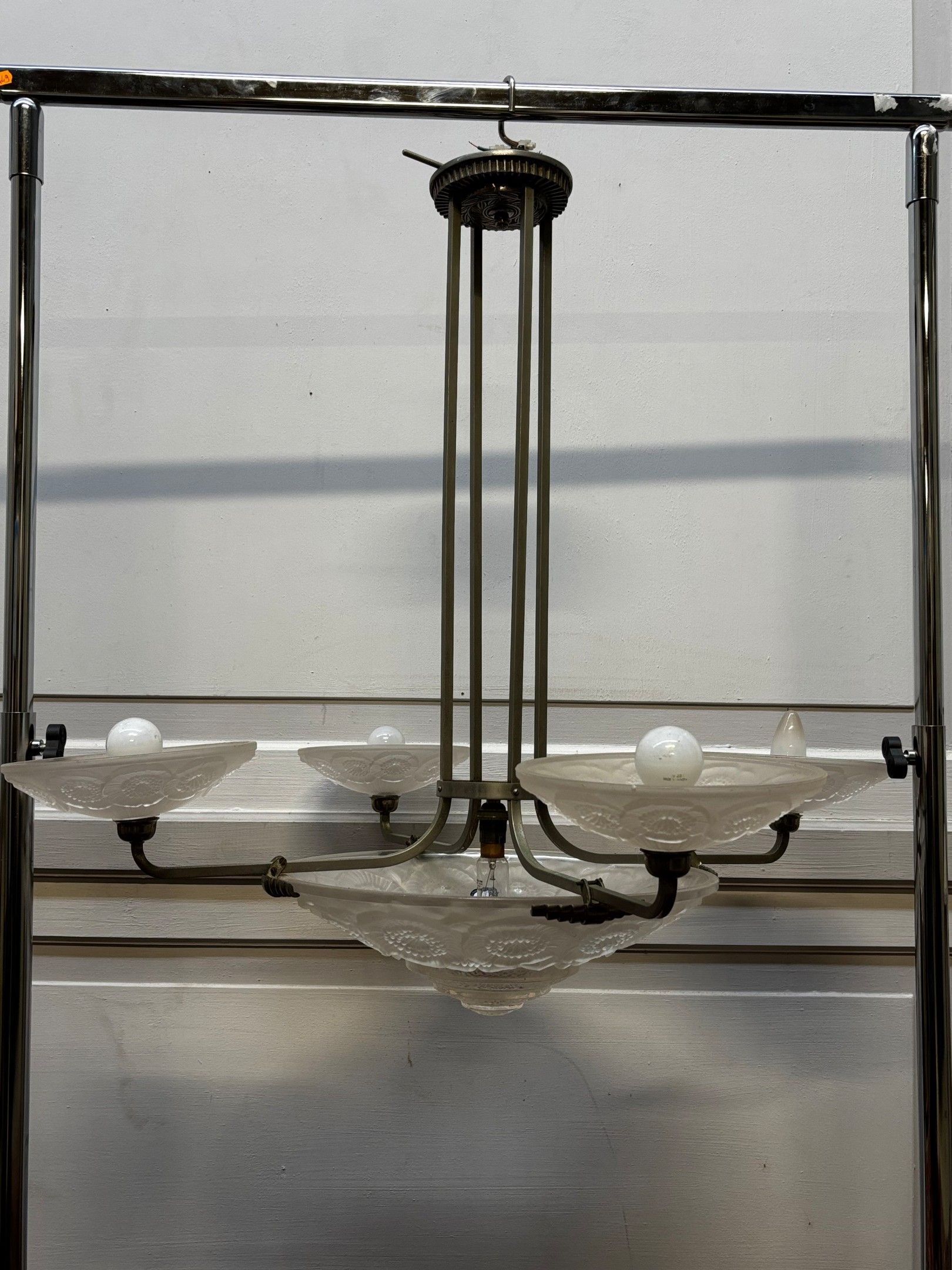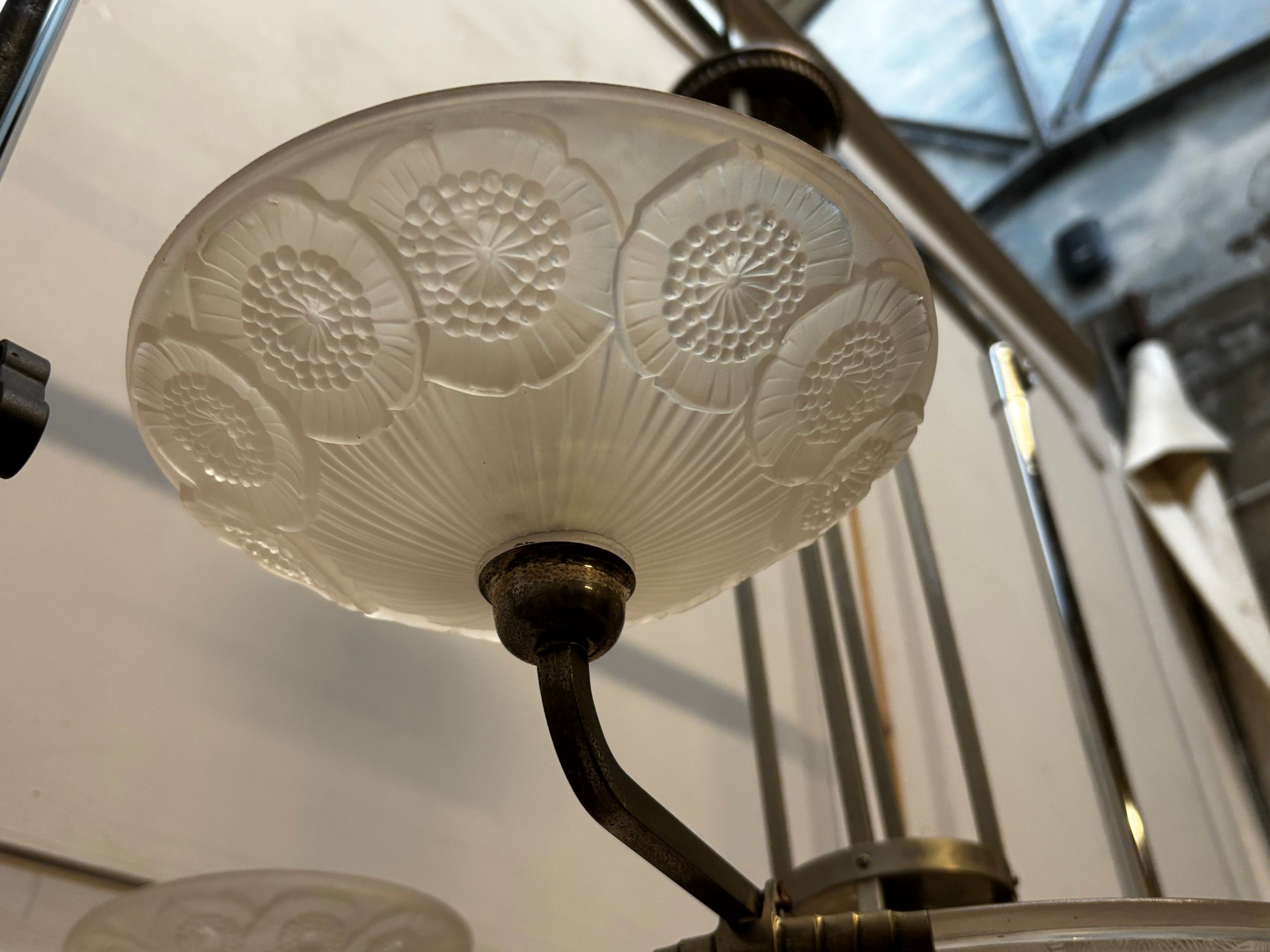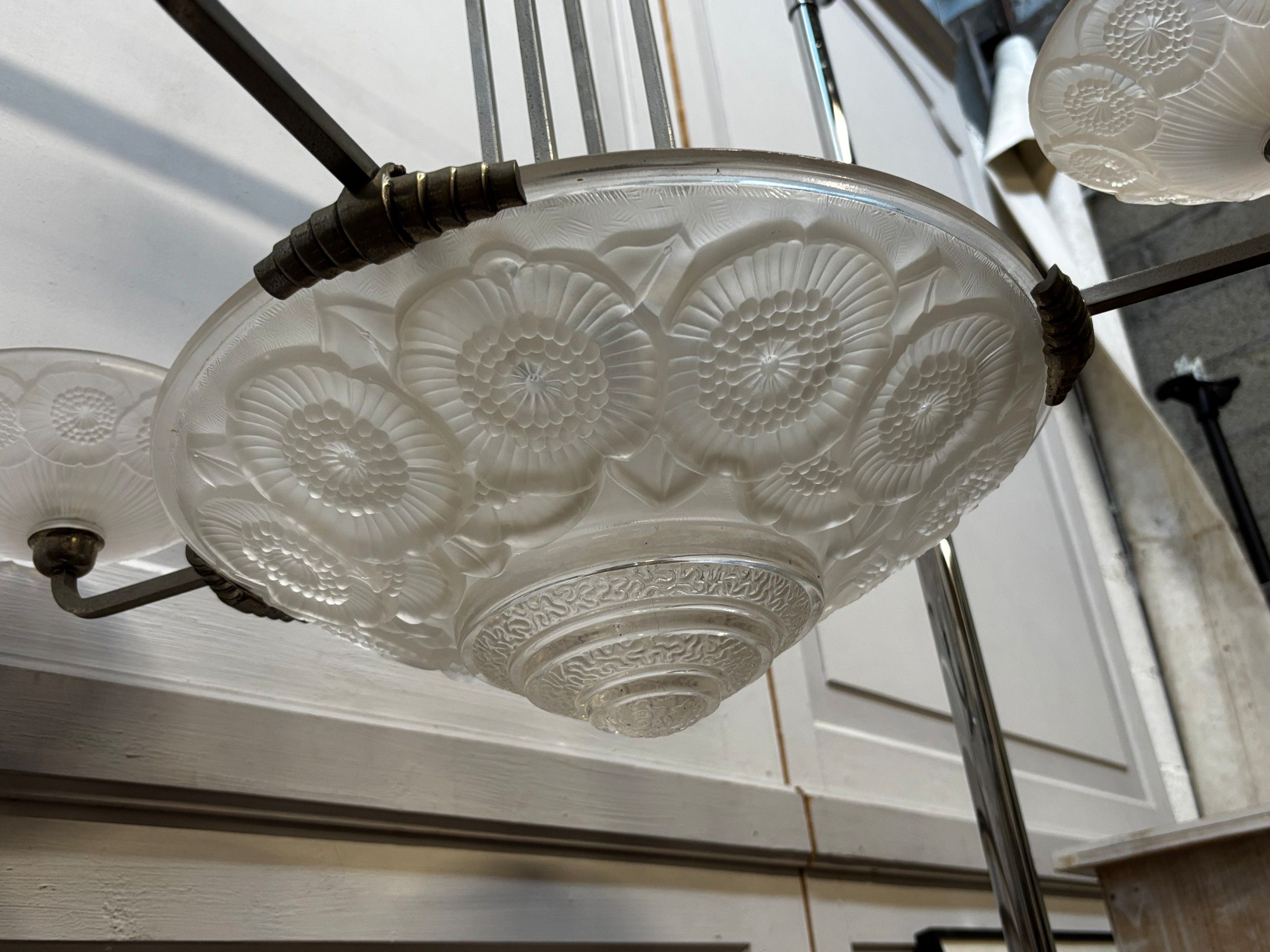 SUSPENSION en métal à vasque et 4 coupelles en verre moulé pressé à décor floral stylisé.
