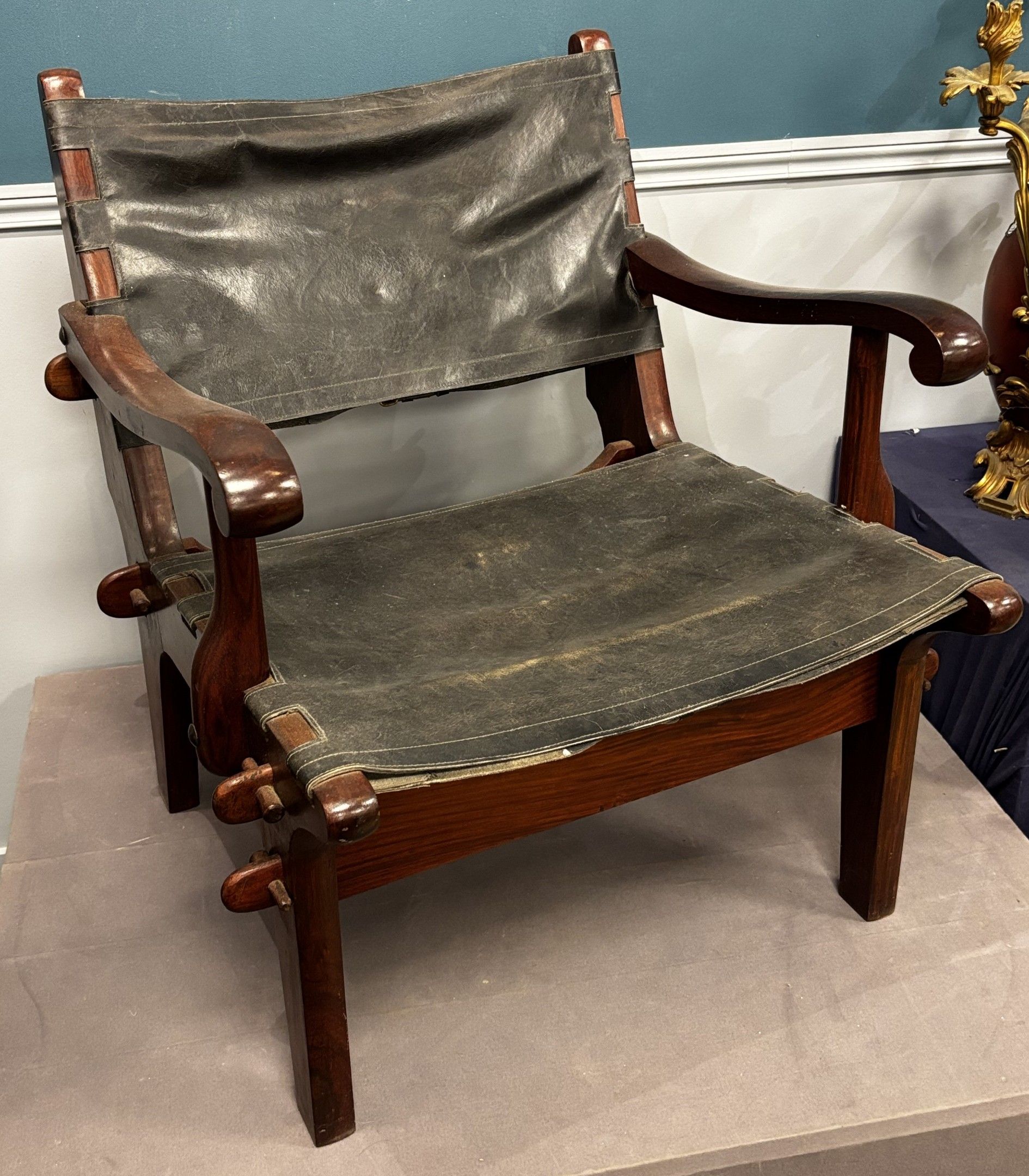 Fauteuil en bois exotique et cuir.