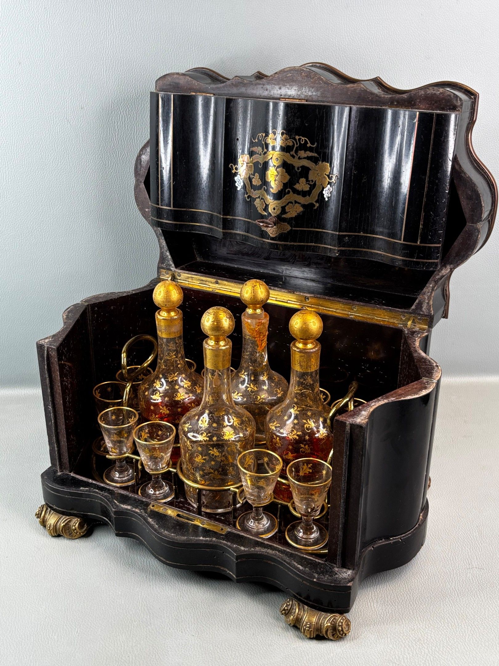 CAVE à liqueurs en bois noirci et incrustations de laiton et nacre contenant : 4 carafes et bouchons, 12 verres (acc à une carafe)