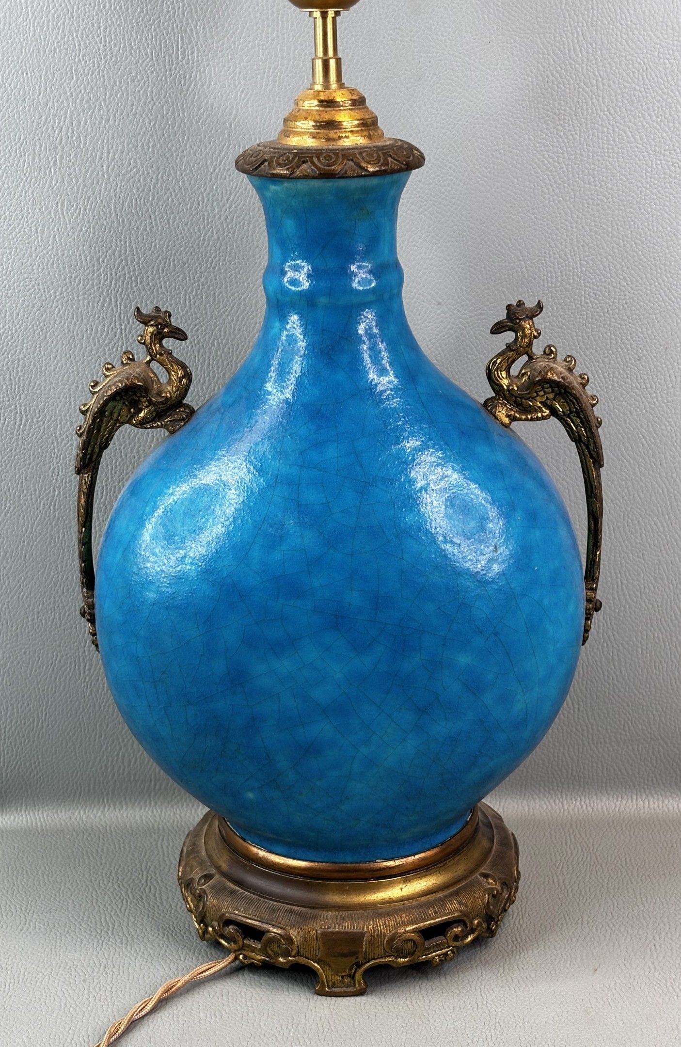 LAMPE à vase en céramique émaillée bleu à monture en bronze