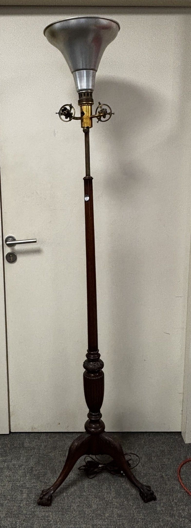 LAMPADAIRE à fût en acajou sculpté à pied tripode « clock & ball »