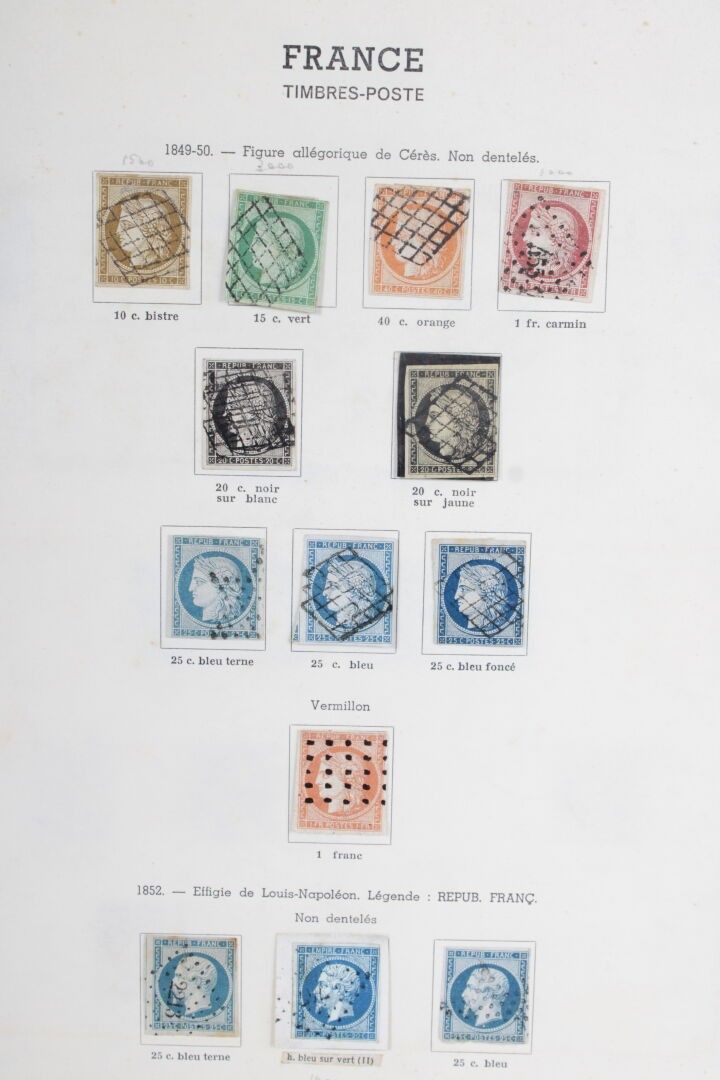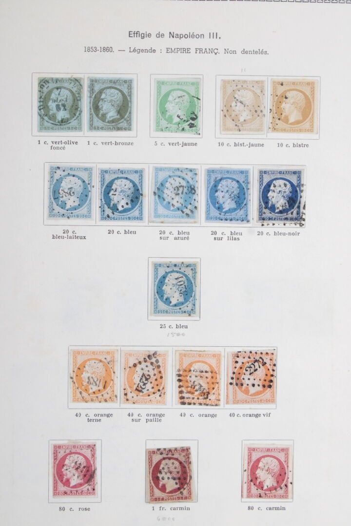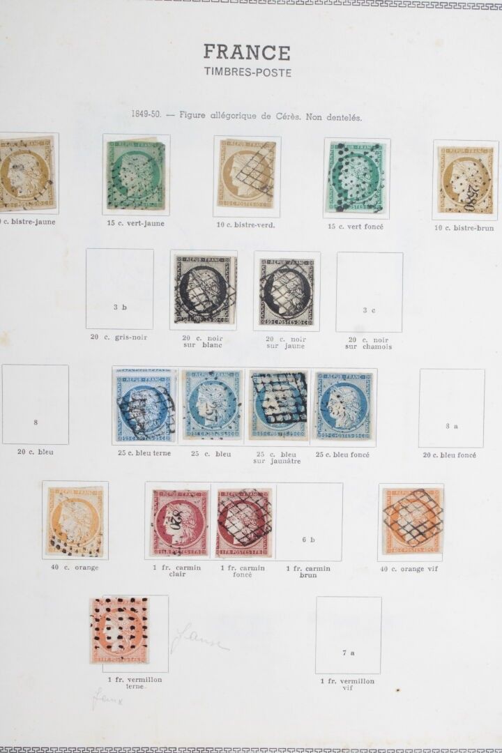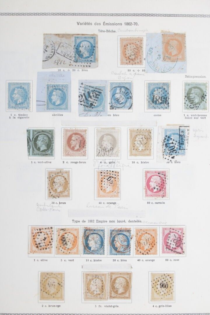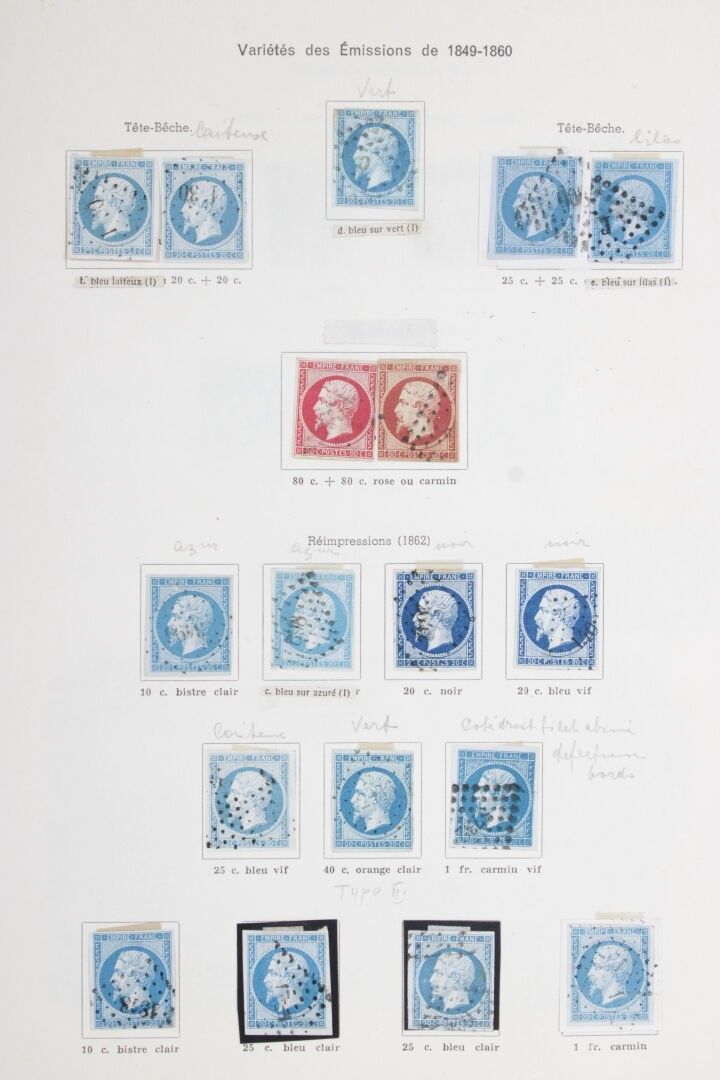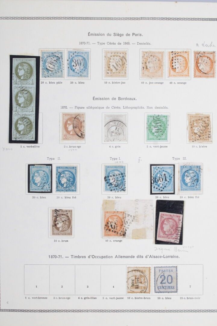 Collection de France présentée en un album "dans son jus" des origines à 1943 avec l'ensemble des bonnes valeurs de la période sauf n°7, n°34 et bleu de Prusse, la partie classique par multiples en détachés et sur lettres dont ballons montés, n°6 sur lettre oblitération sur 20 centimes noir n°3