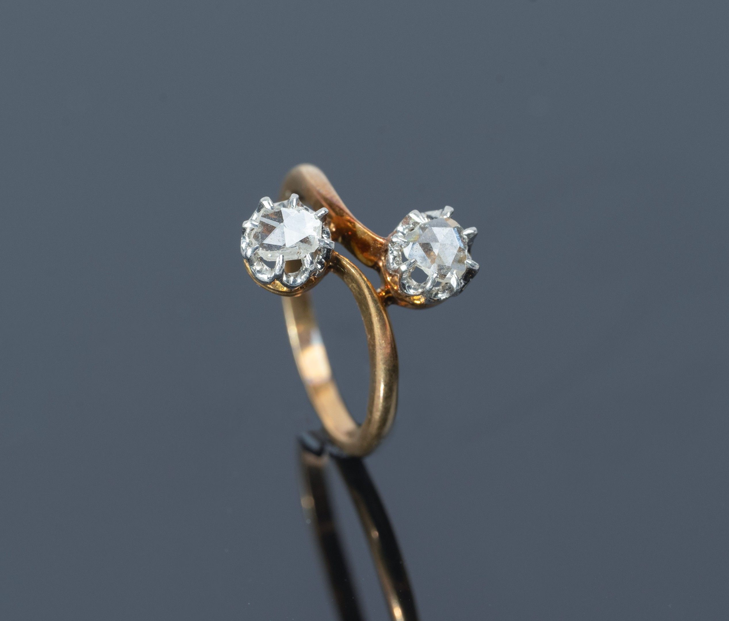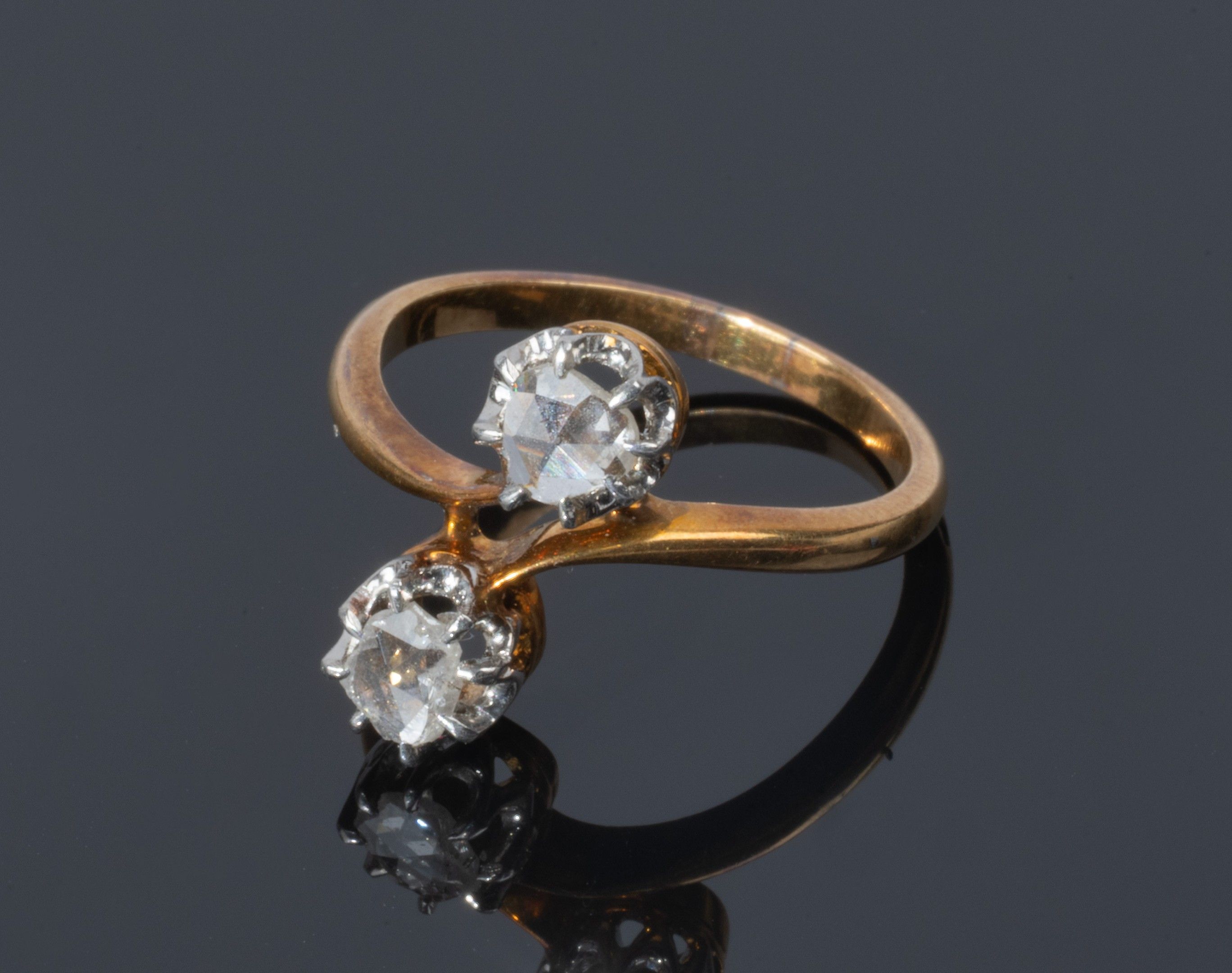 Bague toi et moi à monture en or rose 18 carats (soit 750/1000e) ornée de deux diamants alternés, poids brut : 3,5 g. Tour de doigt : 51,5