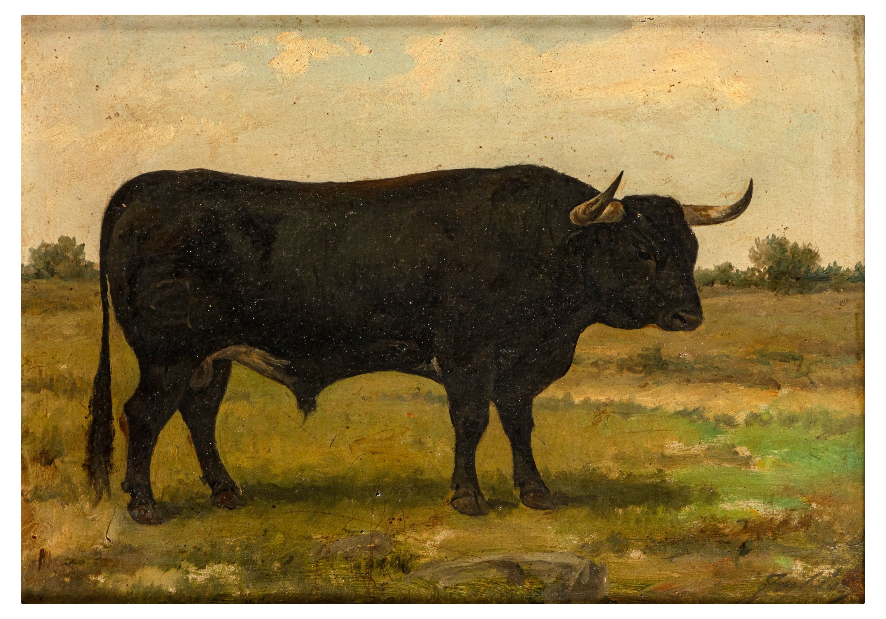 Luis JULIA y CARRERE ( 1910) Taureau Huile sur carton, signée en bas à droite et légendée au verso 25 x 35 cm