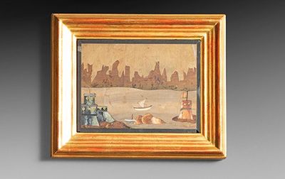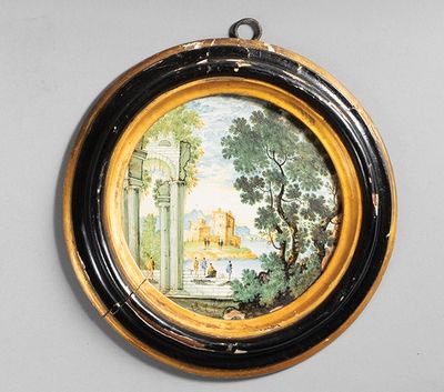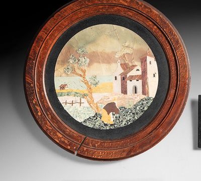 Plaque circulaire en scagliola, à décor de paysage animé d’u…