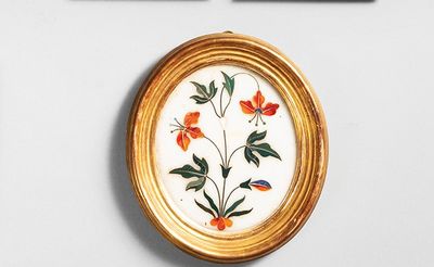 Plaque ovale en marqueterie de pierres dures, à décor de bra…
