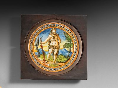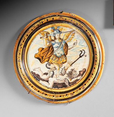 URBINO Médaillon circulaire en majolique à décor polychrome …