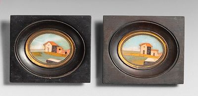 Paire de plaques ovales en marqueterie de pierres dures, à d…