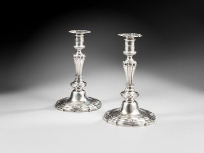 Paire de bougeoirs en argent fondu, la base à bord filet con…