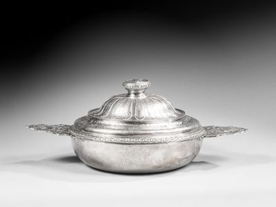 Ecuelle circulaire et un couvercle en argent, les anses à dé…