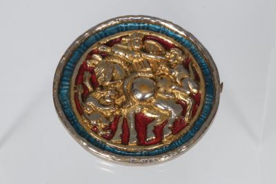 JEANNE PEROL Broche ronde en métal et émail rouge et bleu Di…