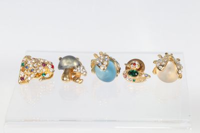Lot de cinq pins en métal doré dont verre et strass, figuran…