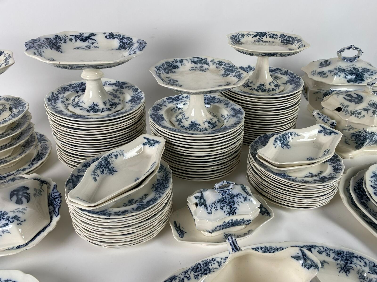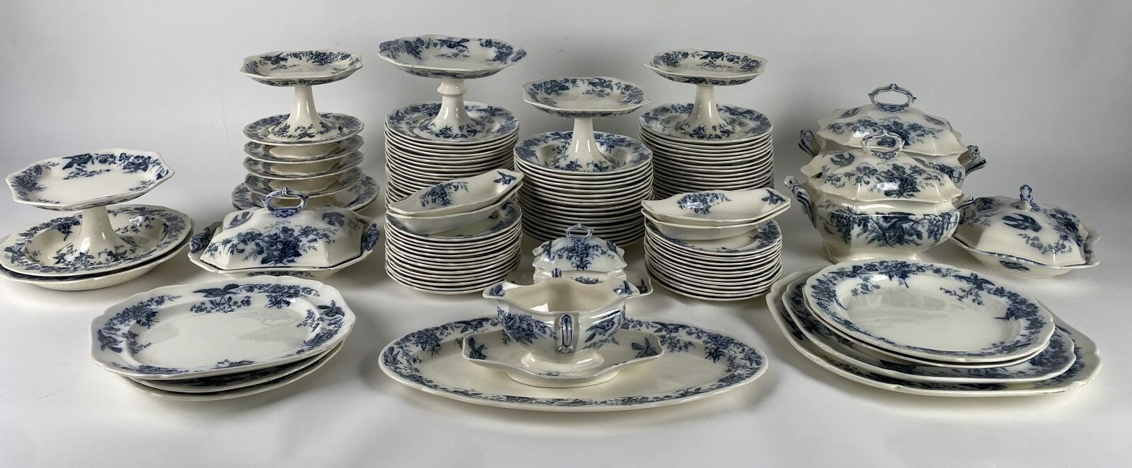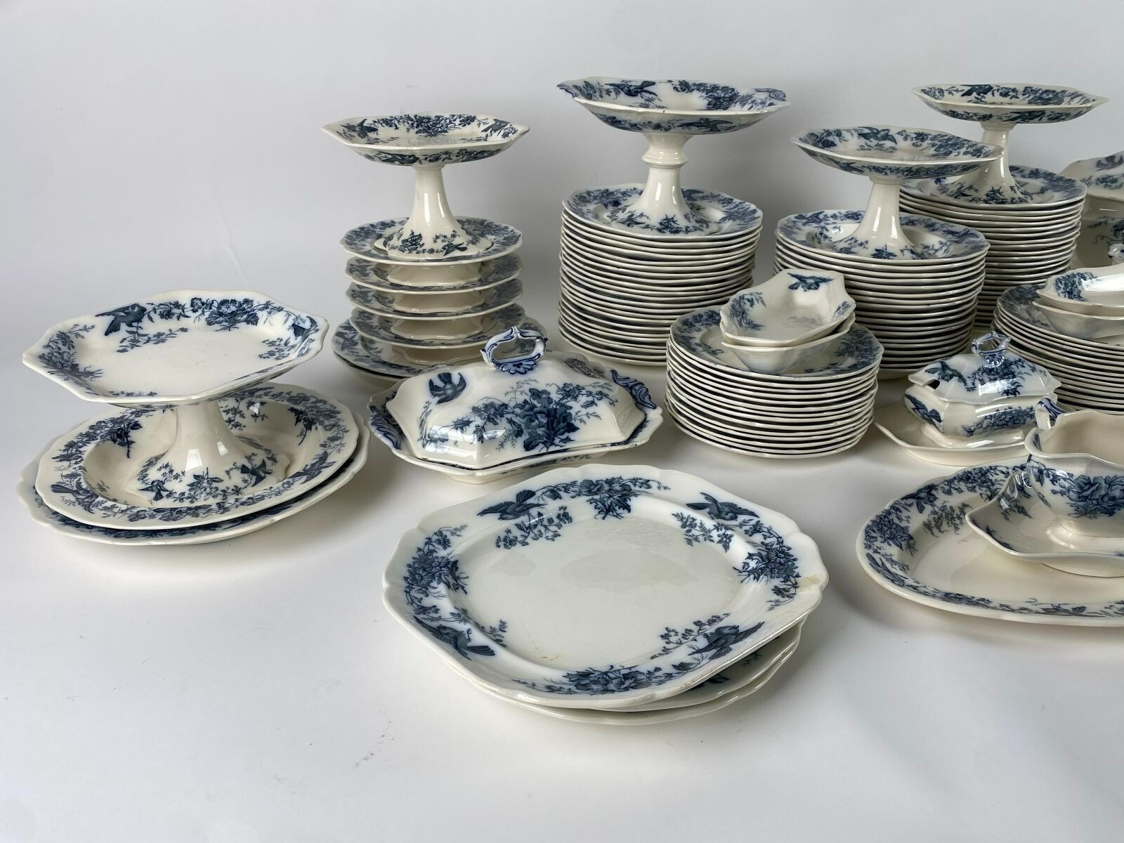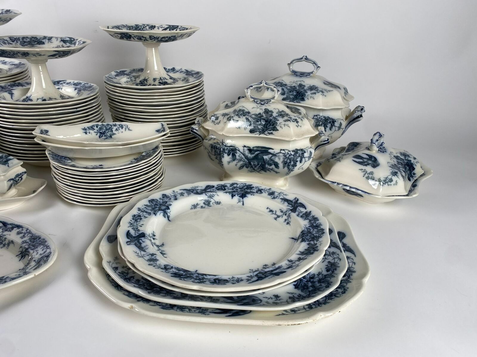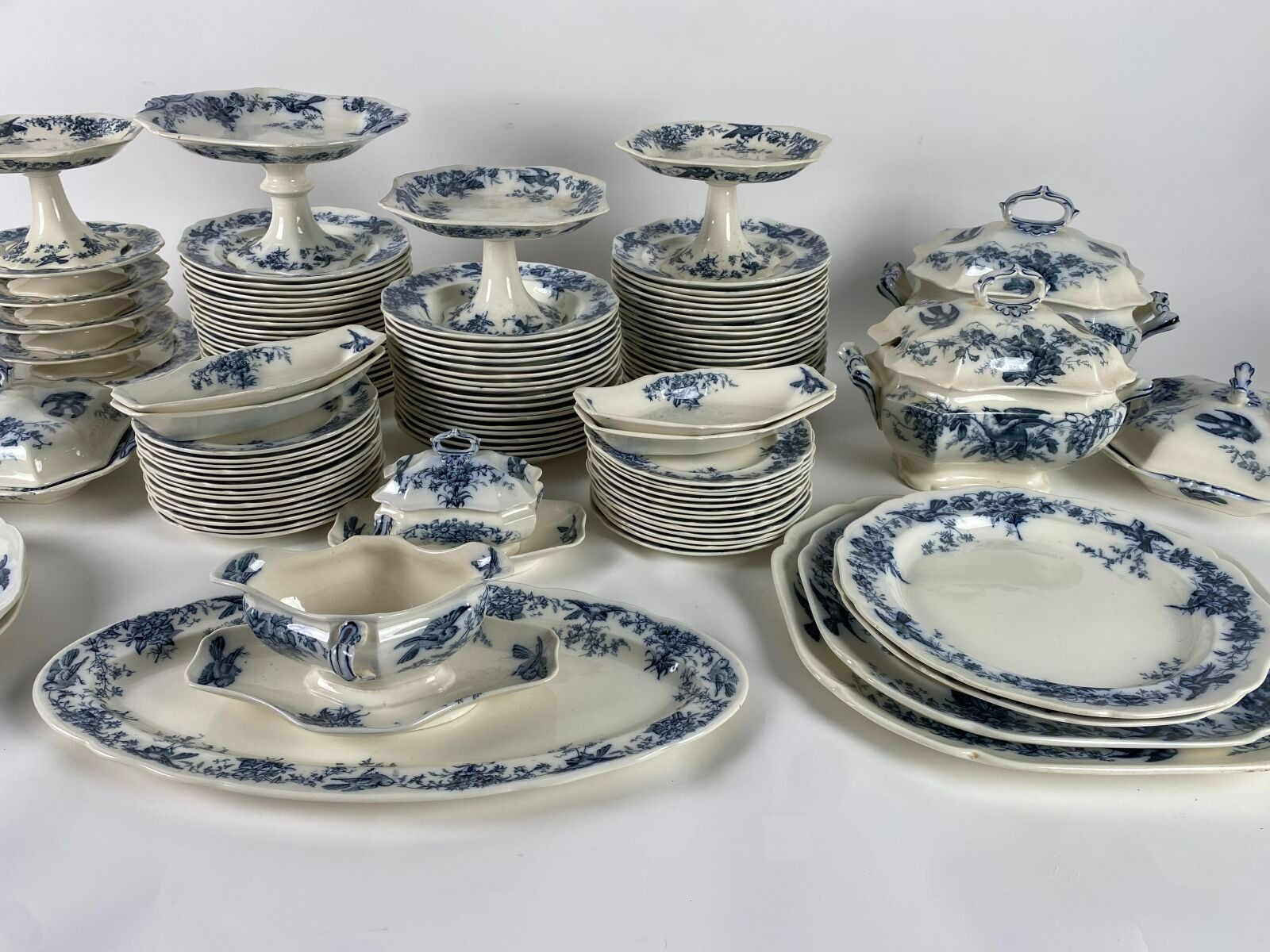Manufacture BROWN WESTHEAD MOORE & CO. Modèle INDIANA. Une partie de service de table en faience fine anglaise à décor floral et d'oiseaux comprenant 45 assiettes plates, 18 assiettes creuses, 27 assiettes à dessert, 4 raviers, 1 soupière, 1 légumier, 5 présentoirs sur pied, 12 plats de services, 1 saucière, 2 plats avec couvercles et 1 terrine couverte.